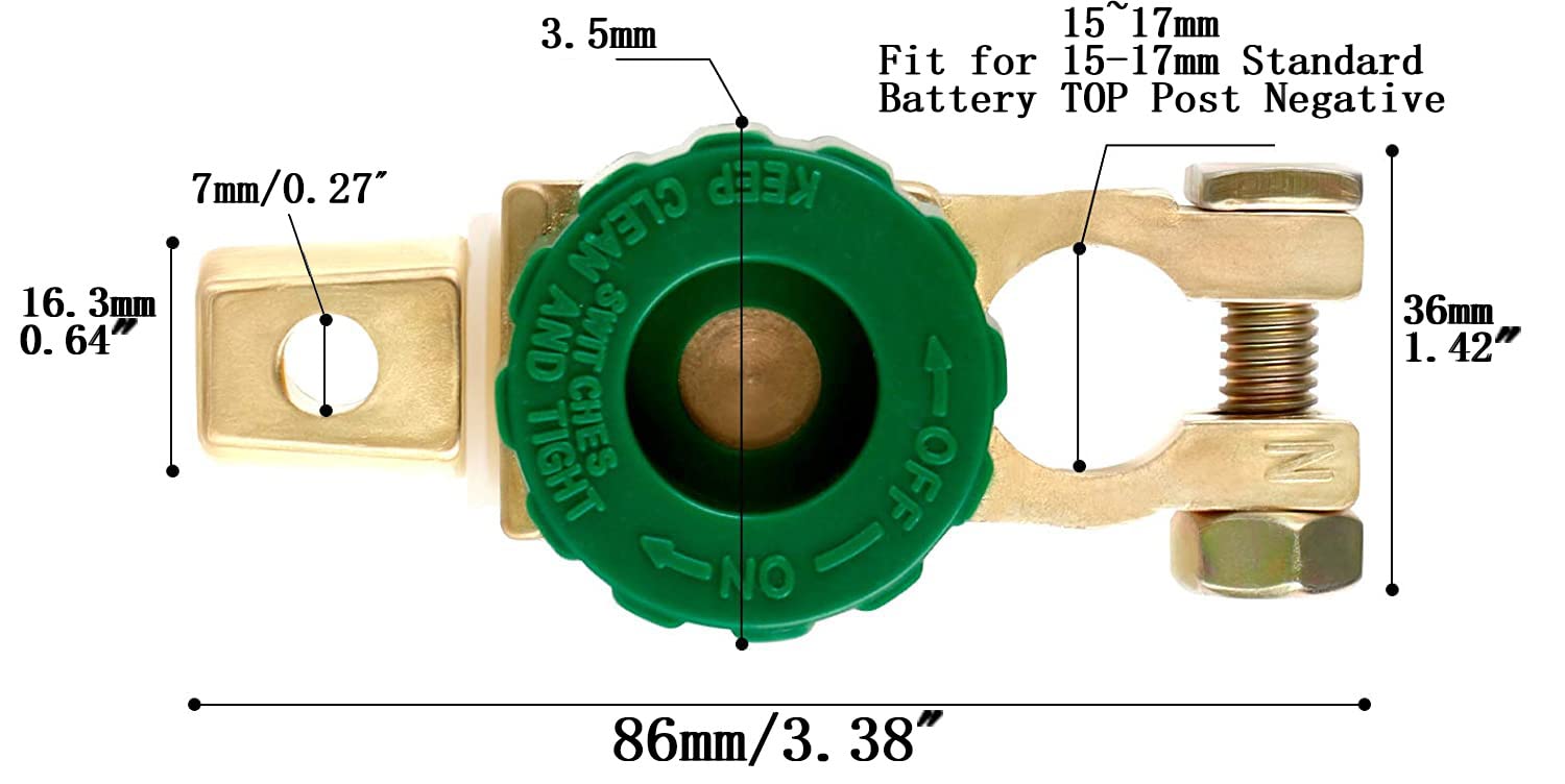 2. Tamanho Compatível: Adequado para baterias com terminais de cone superior de 15-17mm, suporta tensões de 6V a 24V e uma corrente de até 125 Amp. Ideal para carros, veículos recreativos (RV) e barcos, além de ser utilizado em equipamentos elétricos.