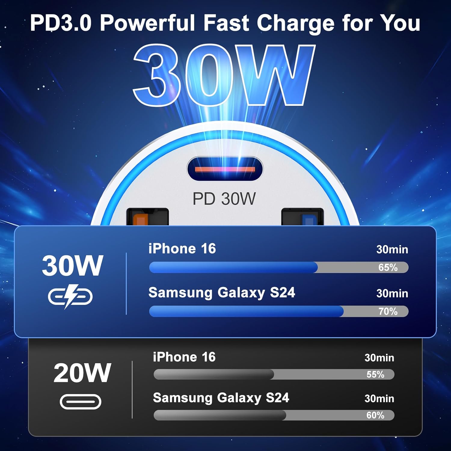 – 65W PD & QC Carregamento Rápido: O adaptador de carregador USB-C de 65W oferece carregamento rápido para dispositivos como iPhone, iPad e Samsung. Os ports USB-C (PD3.0) podem fornecer até 30W, permitindo que você carregue seu iPhone de 0 a 65% em apenas 30 minutos, e o Samsung Galaxy S24/23 Ultra até 70% no mesmo período. O port QC 3.0 de 18W também garante que a maioria dos dispositivos Android seja carregada de 0 a 60% em apenas 35 minutos, otimizando seu tempo de viagem.