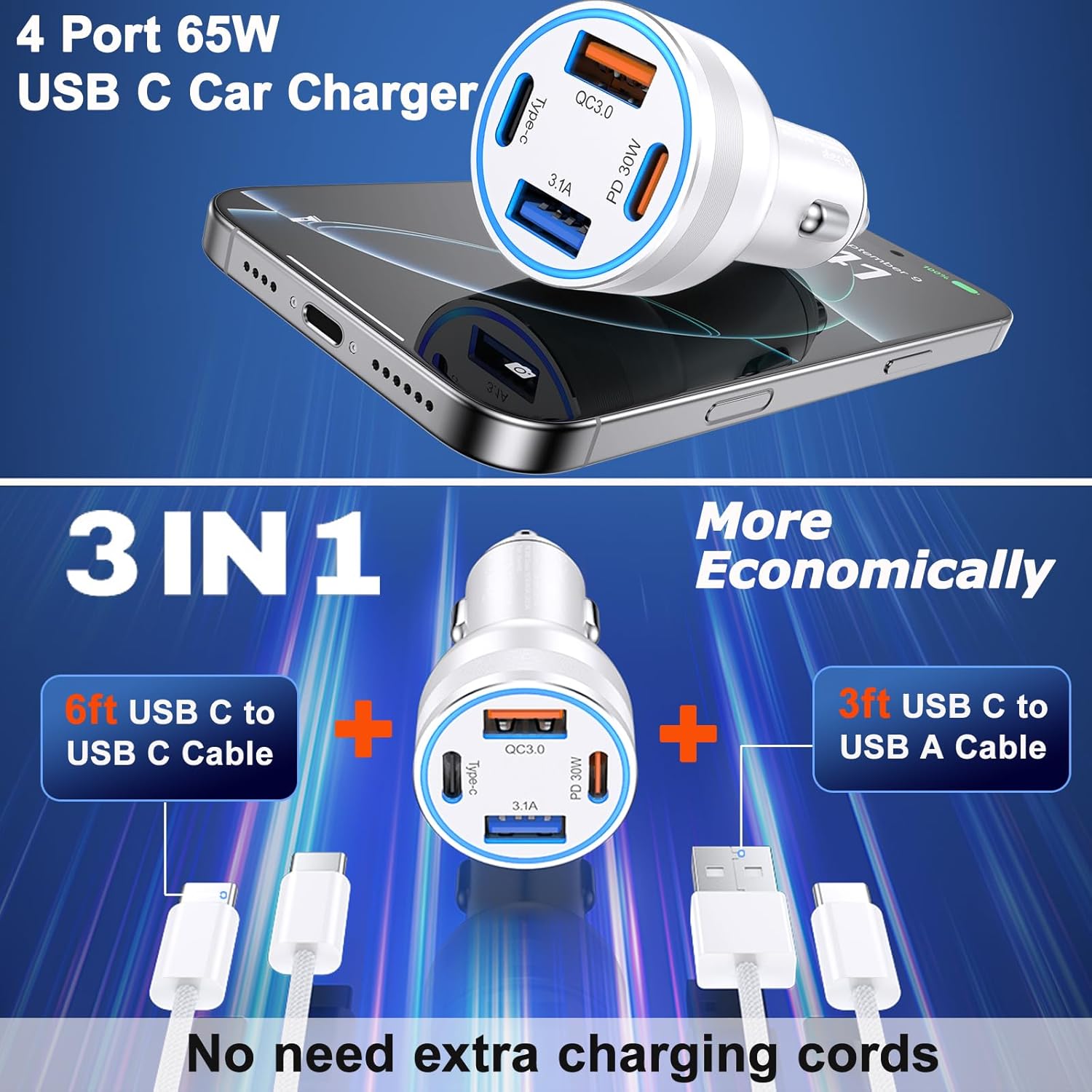 My wife and I recently upgraded our iPhones from 11s to 16s, so of course along with this upgrade came the change in lightning to USB C ports in the phones. Time to also upgrade/replace all of our chargers. We could have gone with USB A to USB C adapters, but I really wanted to take advantage of the fast personal device charging capabilities that USB C offers, and my old car chargers have just USB A. This 65W USB C car charger and charging cables works perfectly. I’ve noticed that my phone can get to about 50% after just 30 minutes in the 30W PD slot, which is crazy fast in comparison to what I’m used to. The 6-foot cable is the perfect length too so I can let passengers in the back use it too, if needed. I just coil it up with some Velcro in front if I’m using it to help keep it organized. The 2nd 4-foot cable is great for a second device or for a passenger to charge at the same time as me. Very happy with this set!