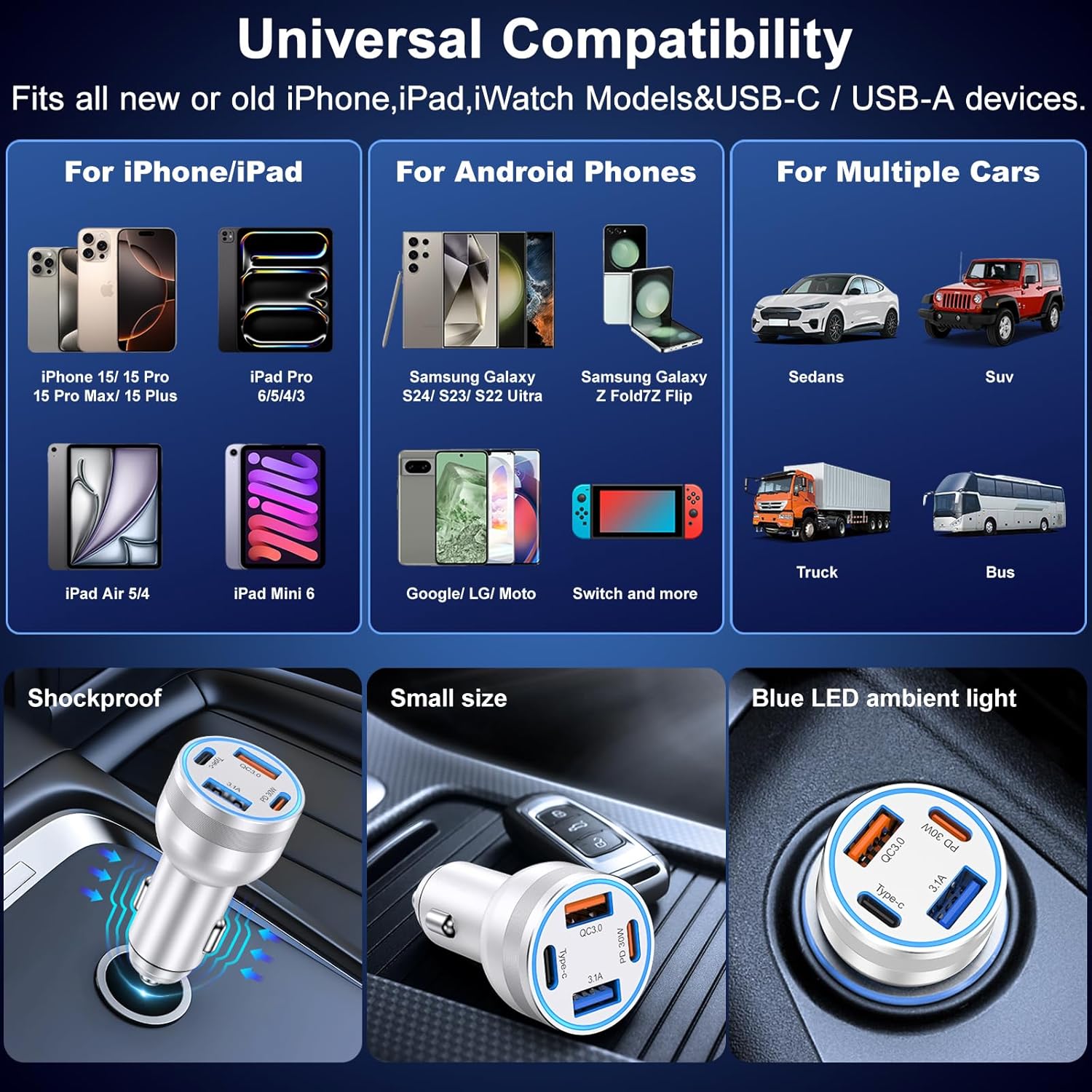 – Compatibilidade Ampla: O carregador é compatível com uma vasta gama de dispositivos, incluindo iPhones das séries 16/15/14/13/12/11, iPads Pro/Air/Mini, Samsung S25/S24/S23/S22/S21, Google Pixel 9/8/7/6, e muito mais. Funciona em veículos de 12-24V, como carros, caminhões e RVs.