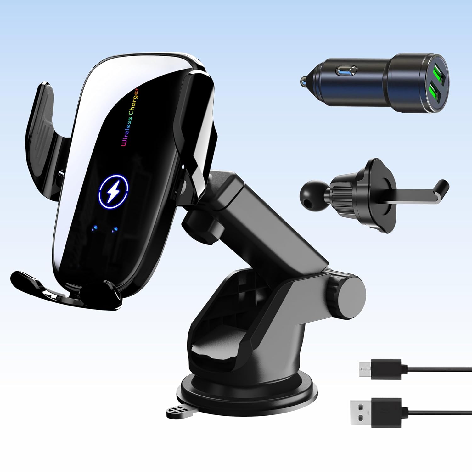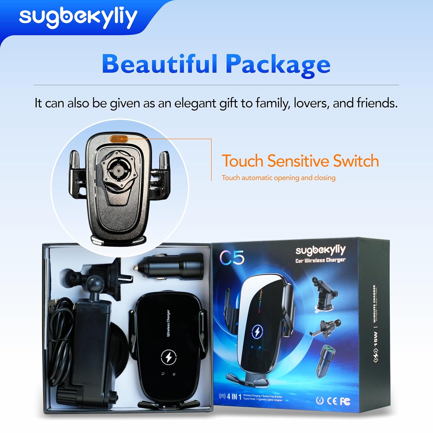Na embalagem, você encontrará um carregador sem fio para carro, um suporte com ventosas, um clipe para ventilação e um adaptador para acendedor de cigarros QC3.0. Sua satisfação é nossa prioridade; se houver qualquer problema com o produto, entre em contato conosco e nossa equipe fará o possível para garantir sua satisfação.
