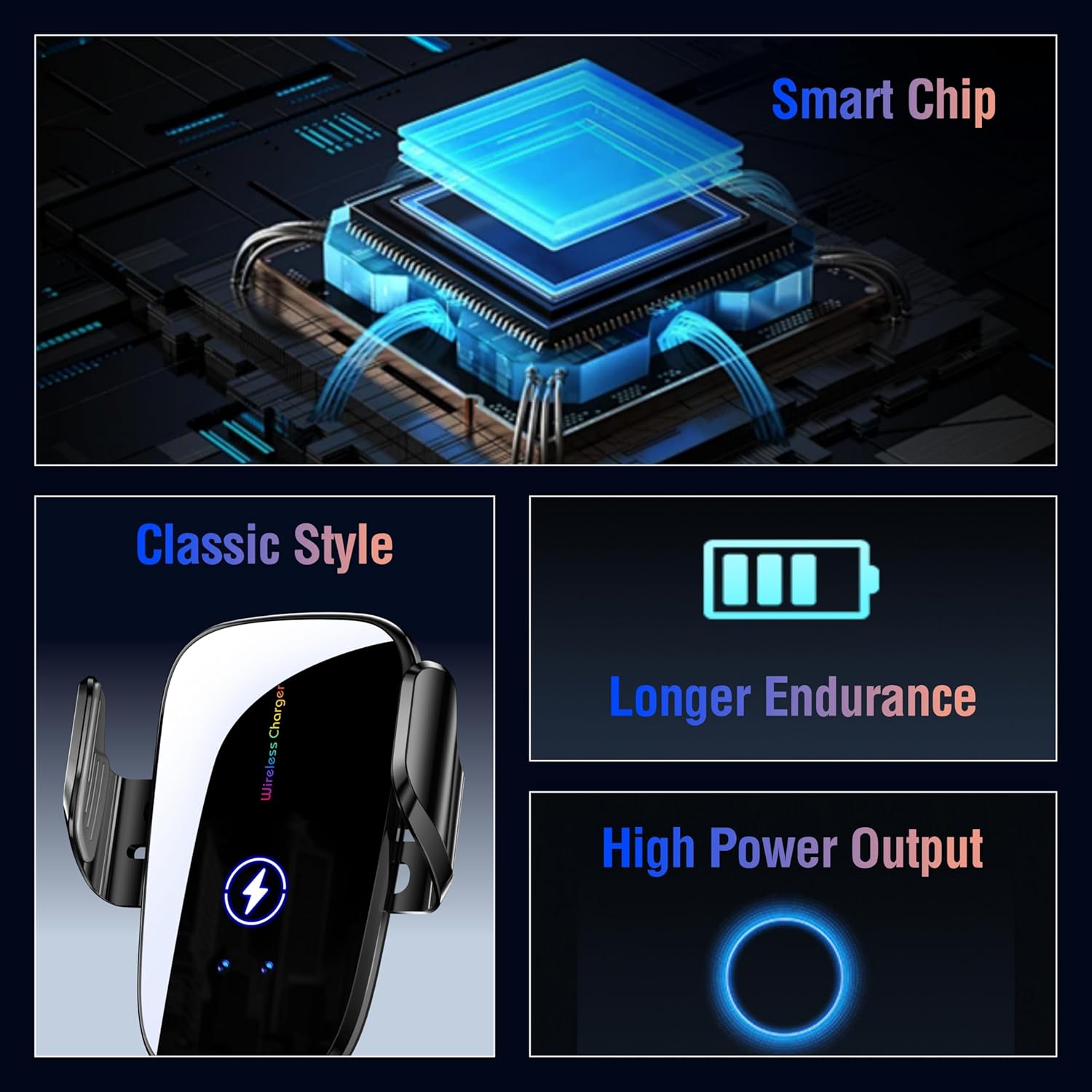 – Compatibilidade Universal: Suporta smartphones de 4.7 a 6.9 polegadas com carregamento sem fio.