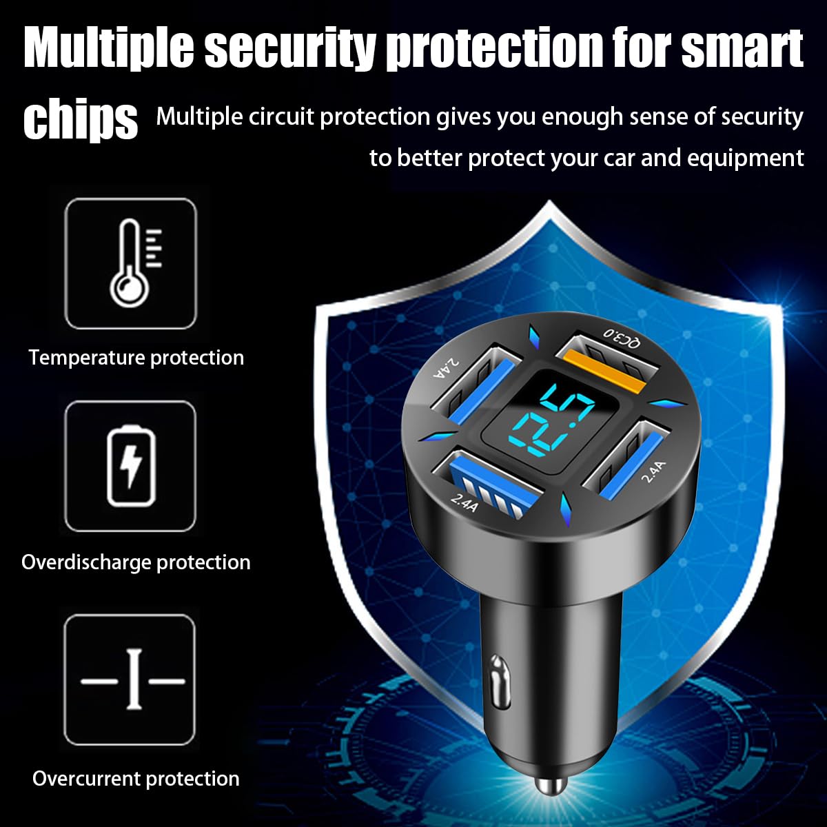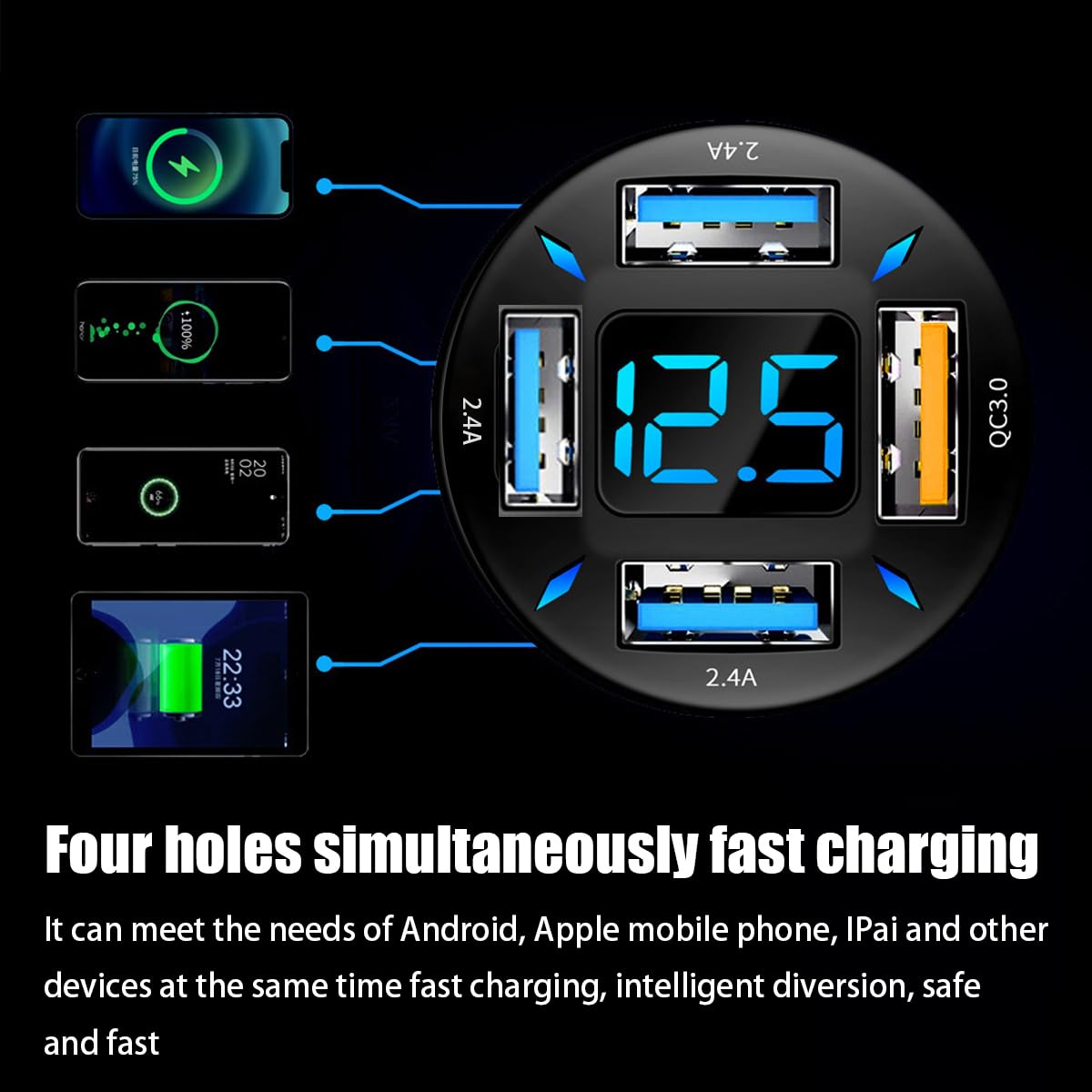 Carregador de Carro USB com 4 Portas, 66W de Carregamento Super Rápido, compatível com QC 3.0 e PD 20W. Possui adaptador USB 2.4A e função de Carregamento Rápido com LED Voltmeter. Conecta-se ao acendedor de cigarros do carro (QC3.0, 2PCS). Ideal para carregar múltiplos dispositivos simultaneamente com eficiência, garantindo segurança e praticidade durante viagens.