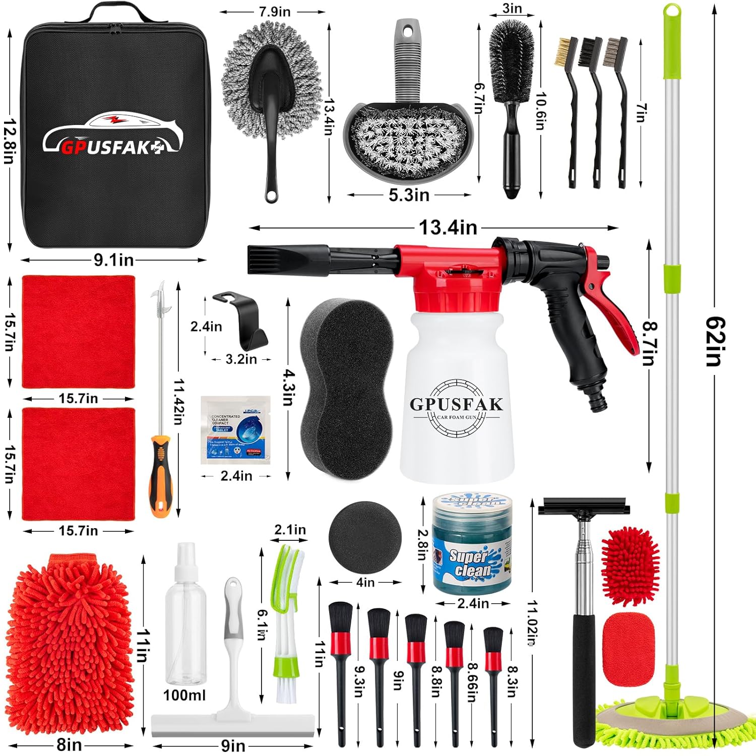 O kit inclui um ferramenta de limpeza de para-brisa com cabo extensível, um spray de 100 ml, uma arma de espuma de baixa pressão com bicos ajustáveis e acoplamento rápido, um mop de cabo longo, um gancho para remoção de pedras, quatro ganchos para carro, uma esponja de lavagem, dois aplicadores de cera, uma escova para rodas, um raspador de água para janelas, uma escova para ar-condicionado, cinco escovas de detalhamento, três escovas de arame, uma escova para pneus, um grande mitone de lavagem, duas toalhas, um pincel e uma bolsa de armazenamento.