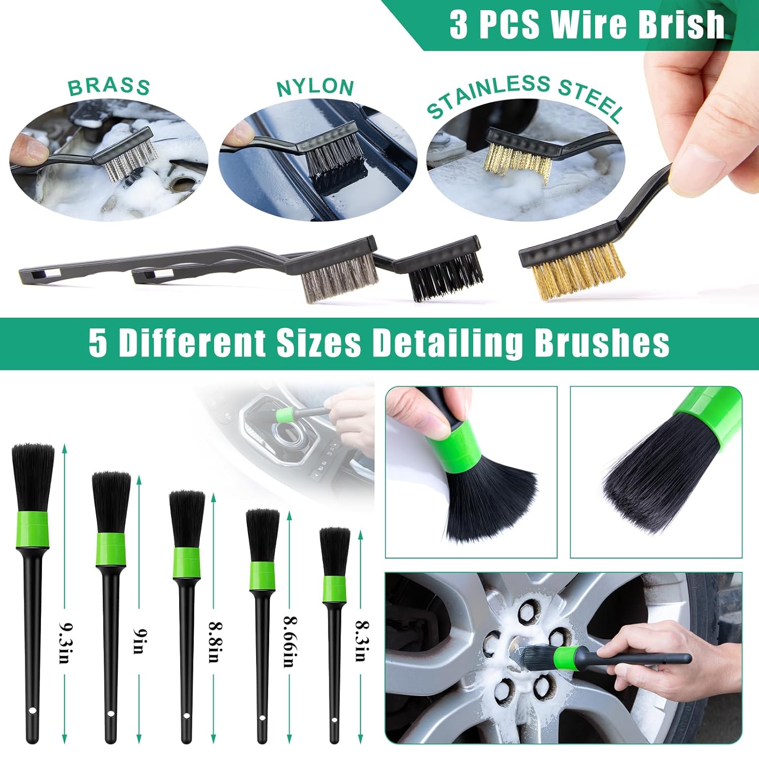 Nosso kit de lavagem de carros inclui um balde de lavagem, permitindo que você lave seu veículo de forma rápida e eficiente. O conjunto de escovas de arame de 3 peças, que contém escovas de latão, aço inoxidável e nylon, é ideal para remover ferrugem teimosa sem danificar a pintura. Além disso, você encontrará 5 escovas de detalhamento de tamanhos diferentes, perfeitas para limpar cada canto do carro e lugares de difícil acesso, como fendas pequenas, saídas de ar, bancos e painel.