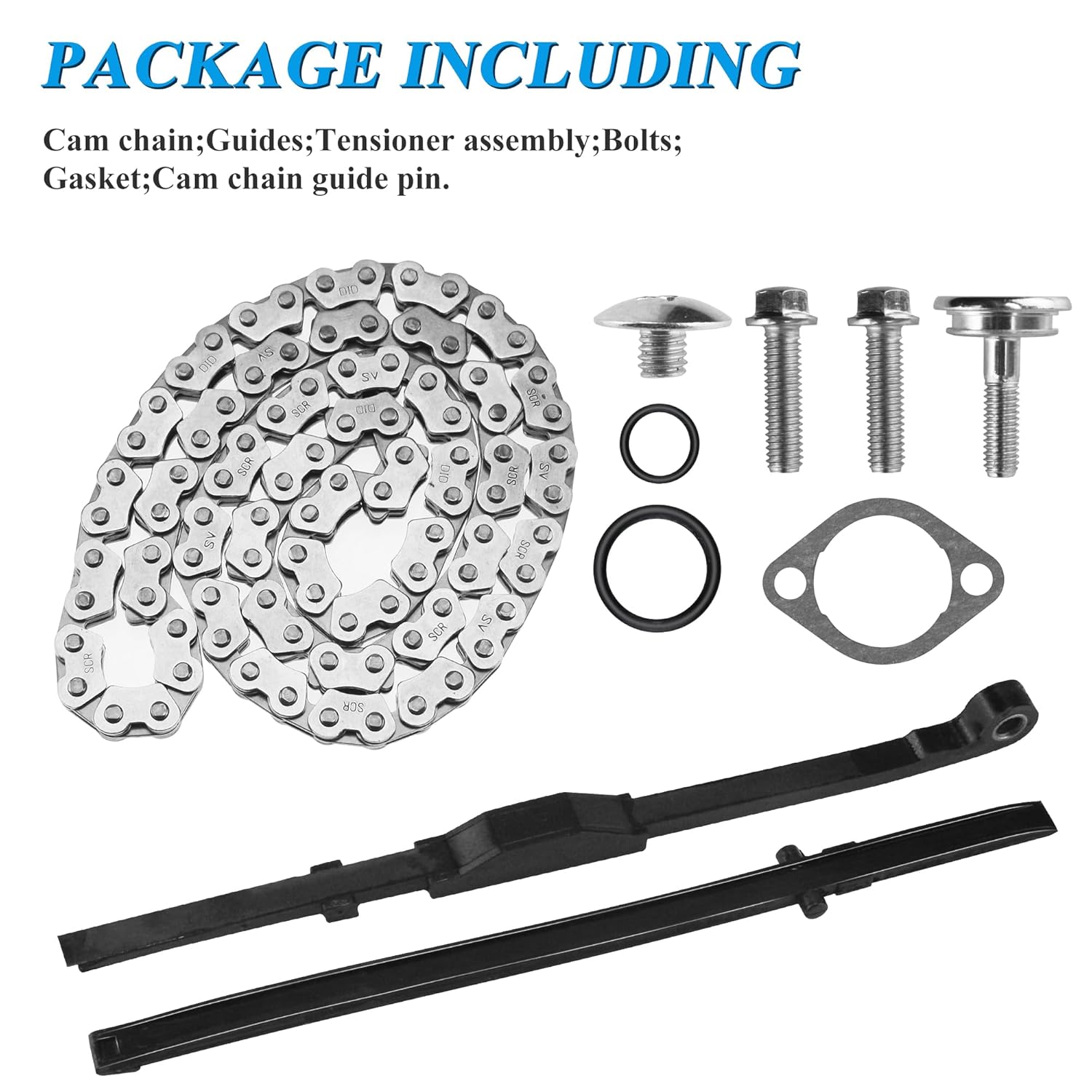 PACOTE INCLUINDO: O pacote contém tudo o que você precisa: corrente de comando, guias, conjunto de tensionador, parafusos, junta e pino guia da corrente de comando. Isso garante que você tenha todos os itens necessários para uma instalação bem-sucedida.