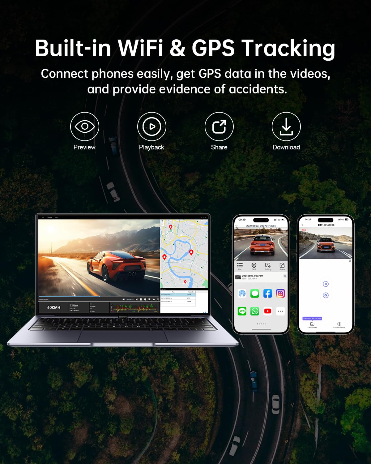 170°+140° True Wide Angle View, Built-In GPS, Super Night Vison Low Light Capture Technology, Built-In WiFi,3.20" IPS Wider Display,Free 64GB Memory Card, Higher Heat/Cold and Longer Product Life, HDR (High Dynamic Range)