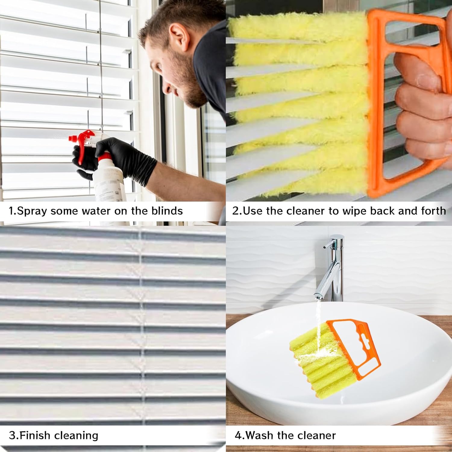 2. Uso da Escova de 7 Dedos: Segure a escova pelo cabo ergonômico e deslize-a suavemente sobre as persianas ou superfícies desejadas, permitindo que os dedos da escova penetrem nas fendas para remover a poeira acumulada.