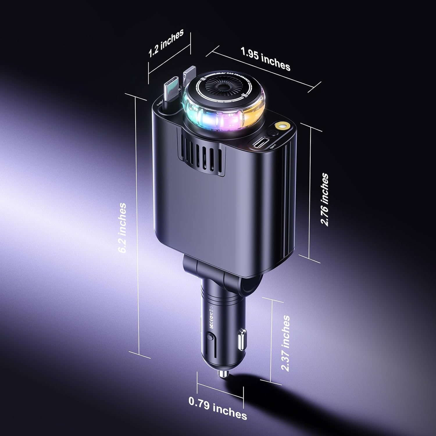 The 5-in-1 Retractable Car Charger with Aromatherapy and Starlight is an absolute must have! This device combines functionality, style, and convenience in one sleek package. The retractable design is genius—no more tangled cables cluttering up my car. It comes with two retractable cables (Type-C and iOS), making it super easy to charge both Android and iPhone devices simultaneously. Plus, the additional USB-C and USB-A ports allow me to charge up to four devices at once—perfect for road trips with family or friends!