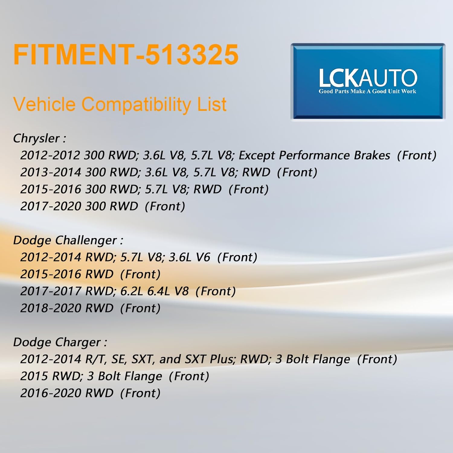 - Compatibilidade do Veículo: O Conjunto de Rolamento 513325 é compatível com Chrysler 300 (2012-2020) e Dodge Challenger/Charger (2012-2020) com motores 3.6L, 5.7L, 6.2L e 6.4L. Para mais detalhes sobre a compatibilidade, consulte a descrição do produto.