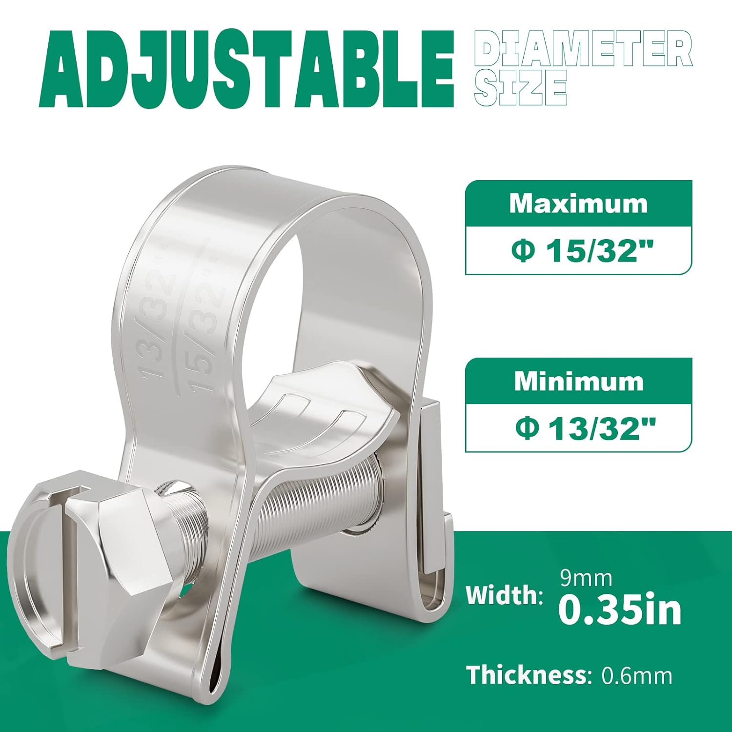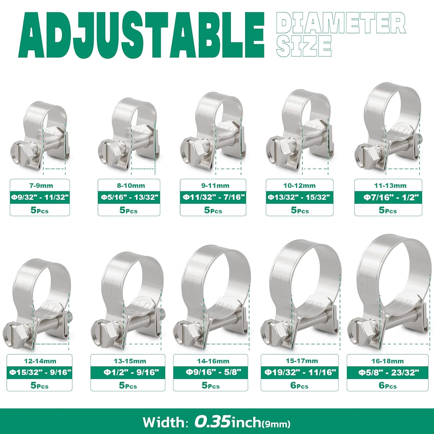 replaced a standard screw clamp on my fuel line with one from this kit, and it worked great. The clamps are made of sturdy 304 stainless steel and feel durable. The adjustable sizes (7-18mm) made it easy to find the right fit for my hose. They held the fuel line securely with no leaks, even under pressure. Installation was straightforward, and the assortment gives you plenty of options for different projects. Overall, a great value for anyone working on fuel lines or small hoses. Highly recommend!