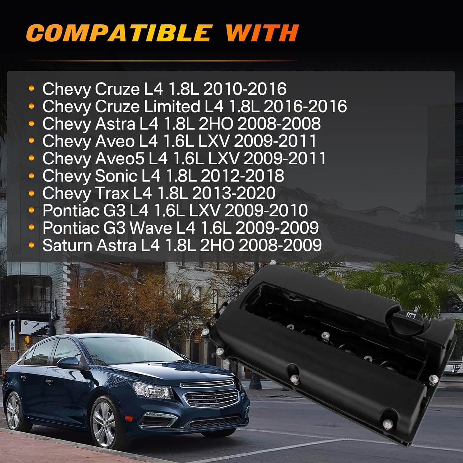 - Compatível com: Este kit é compatível com os modelos 2010-2016 Chevy Cruze L4 1.8L, 2016-2016 Chevy Cruze Limited L4 1.8L, 2008-2008 Chevy Astra L4 1.8L 2HO, 2009-2011 Chevy Aveo L4 1.6L LXV, 2009-2011 Chevy Aveo5 L4 1.6L LXV, 2012-2018 Chevy Sonic L4 1.8L, 2013-2020 Chevy Trax L4 1.8L, 2009-2010 Pontiac G3 L4 1.6L LXV, 2009-2009 Pontiac G3 Wave L4 1.6L, e 2008-2009 Saturn Astra L4 1.8L 2HO.