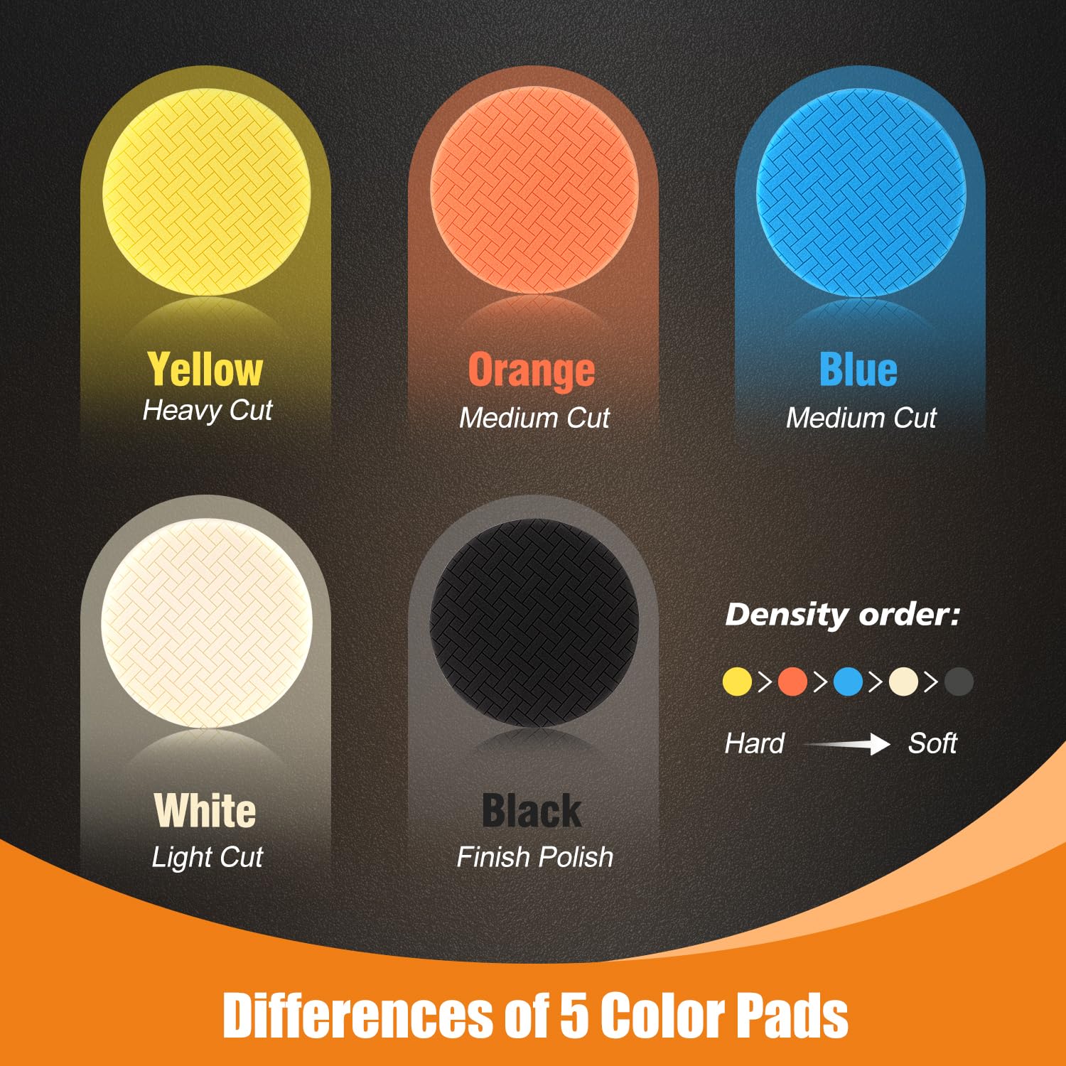 O kit inclui almofadas de polimento em diferentes cores, cada uma projetada para atender a necessidades específicas. As almofadas laranja e branca são perfeitas para a remoção de riscos e defeitos, enquanto a almofada amarela é ideal para aplicar compostos que eliminam oxidações leves. Para um acabamento fino, as almofadas pretas e azuis são recomendadas, permitindo a aplicação de polidores ultra finos, ceras ou selantes.