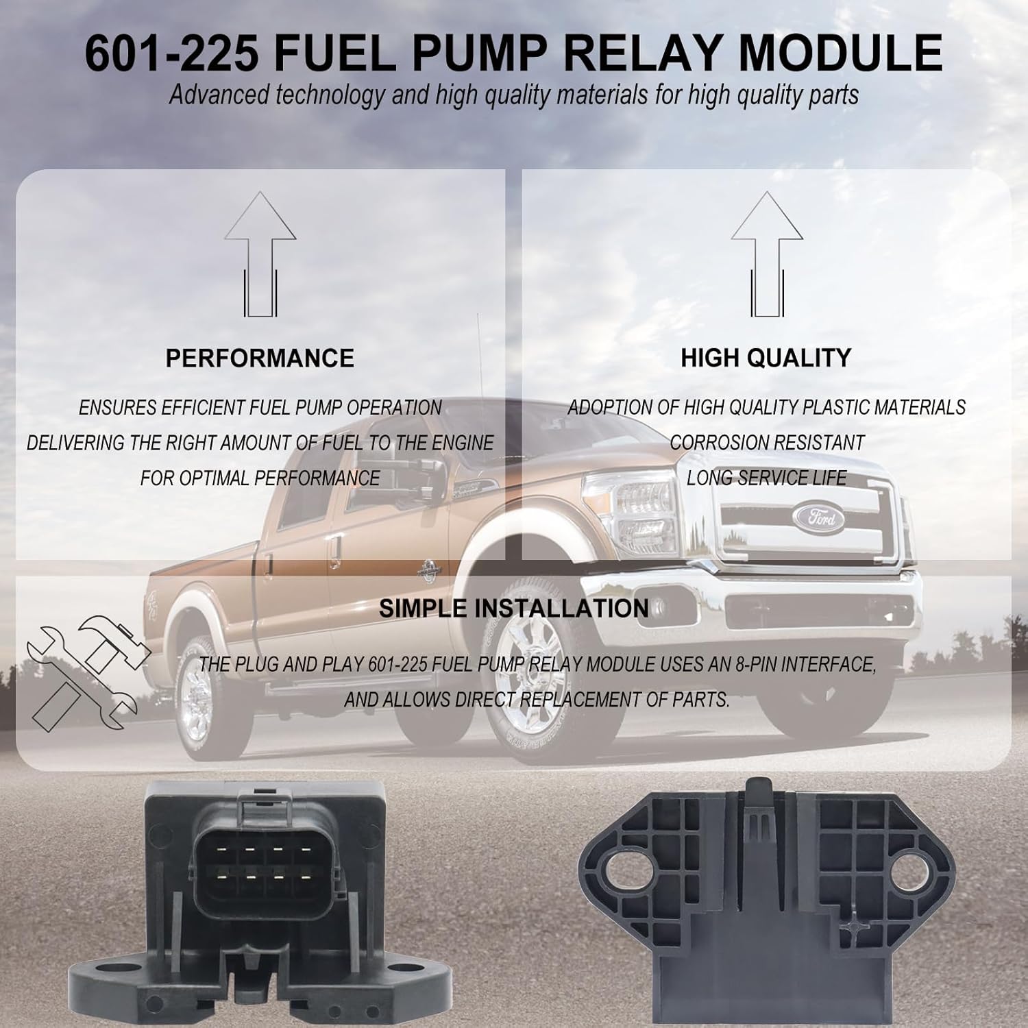 O Módulo de Relé da Bomba de Combustível 601-225 é a solução ideal para garantir o funcionamento eficiente do sistema de combustível em uma ampla gama de veículos Ford, Lincoln e Mercury. Este módulo é compatível com modelos como Ford E150, E250, E350, F150, F250, F350, Edge, Escape, Expedition, entre outros. Com a substituição de peças como 601225, 1R2383 e FD1026, o 601-225 se destaca pela sua alta performance e durabilidade.