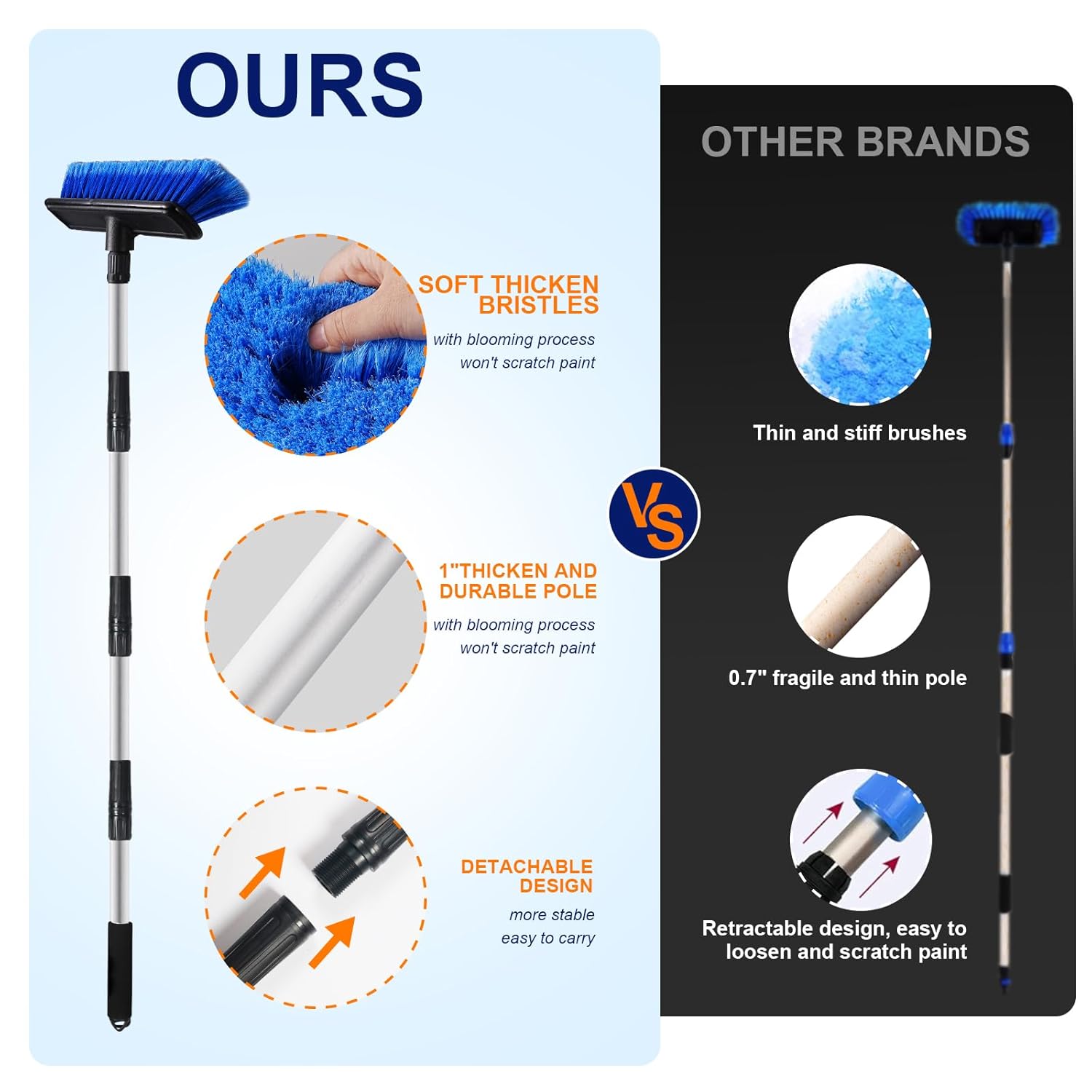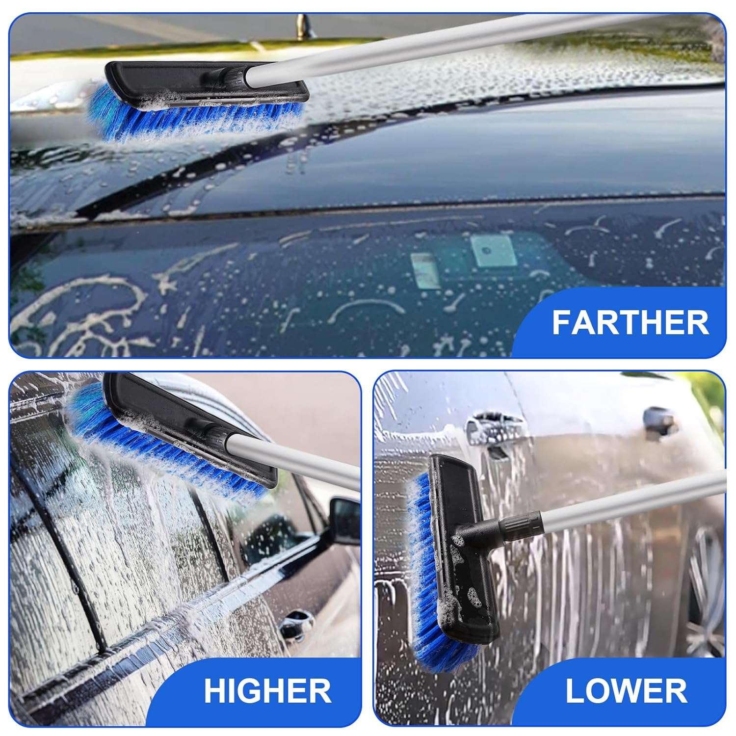 A escova de lavagem possui um cabo longo de 62″, composto por quatro seções de hastes de alumínio de aproximadamente 15,7″ cada. Este design leve e durável facilita o transporte e o manuseio. O sistema de interface roscada garante uma conexão estável e firme, proporcionando uma durabilidade dez vezes maior em comparação com hastes telescópicas tradicionais. Você pode ajustar o comprimento da escova conforme necessário, com opções que vão de 16″ a 62″, permitindo que você alcance áreas de difícil acesso com facilidade.
