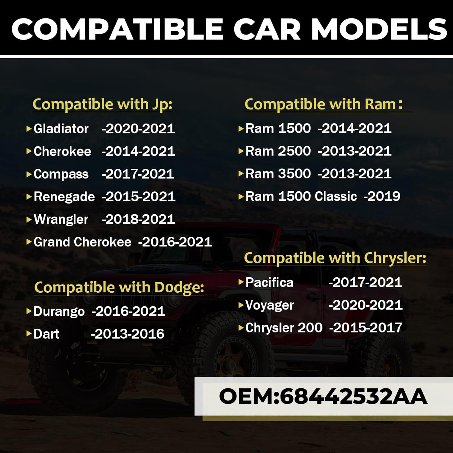 – Compatibilidade: Compatível com diversos modelos Chrysler e Dodge, incluindo 2015-2017 Chrysler 200, 2017-2021 Chrysler Pacifica, 2013-2016 Dodge Dart, 2014-2021 Cherokee, 2013-2021 Ram 2500, entre outros.