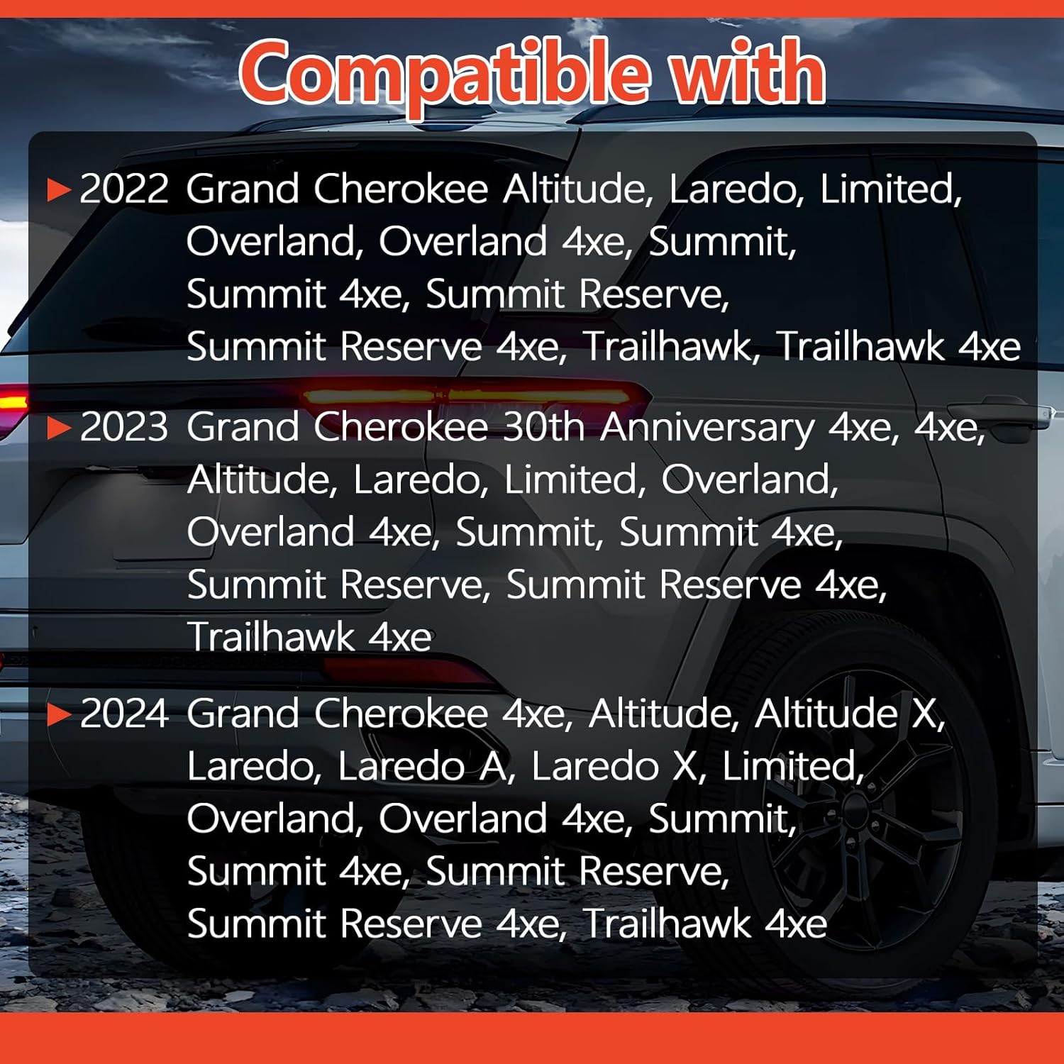 – 2023: Grand Cherokee 30th Anniversary 4xe, 4xe, Altitude, Laredo, Limited, Overland, Overland 4xe, Summit, Summit 4xe, Summit Reserve, Summit Reserve 4xe, Trailhawk 4xe
