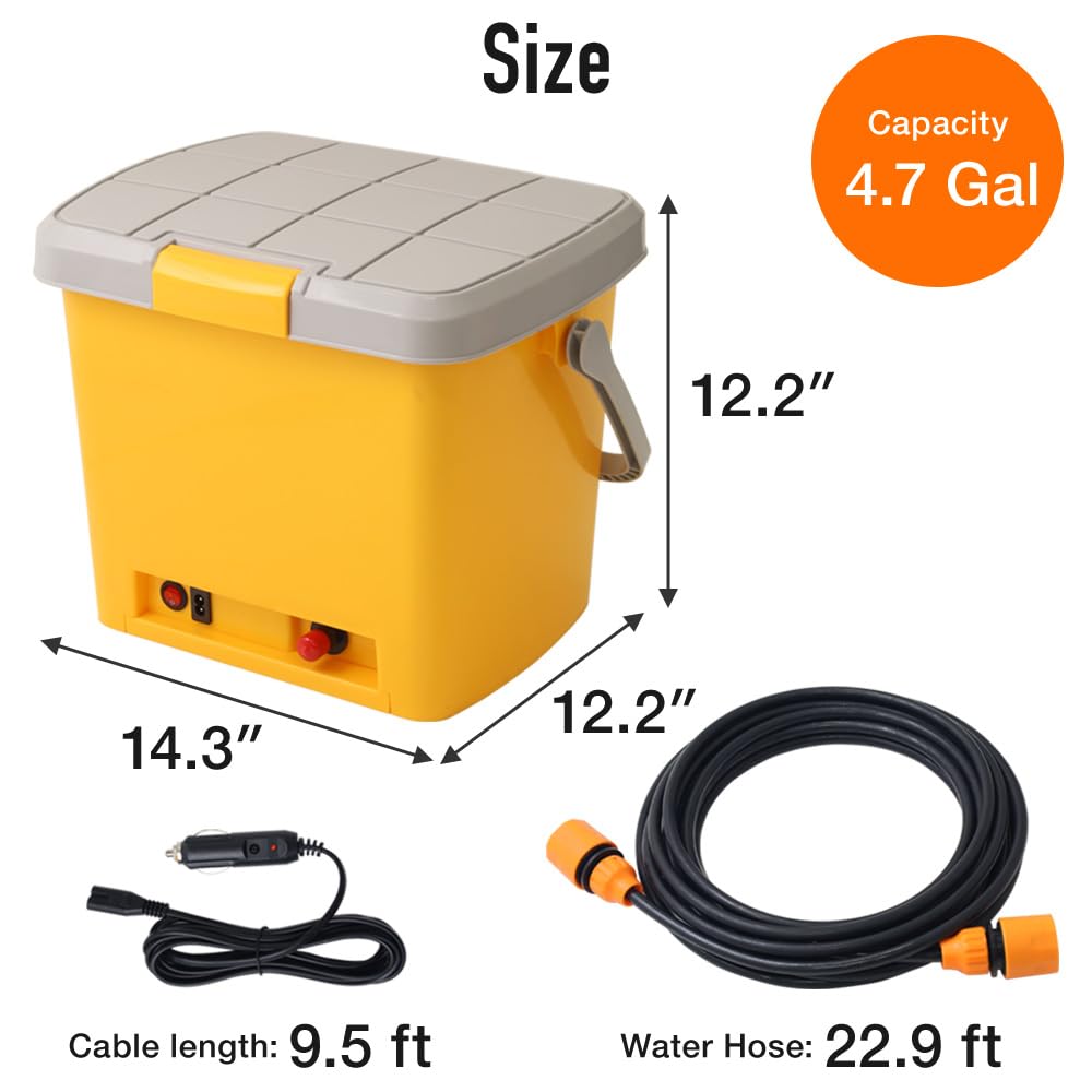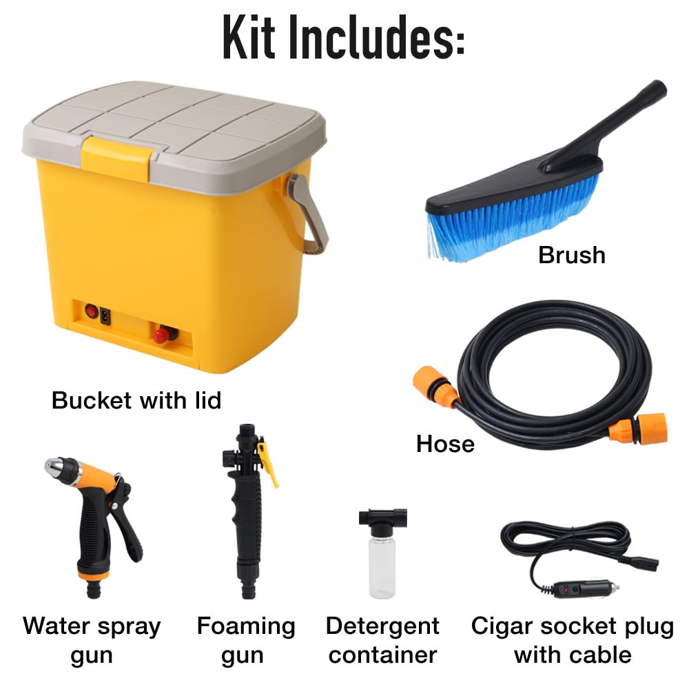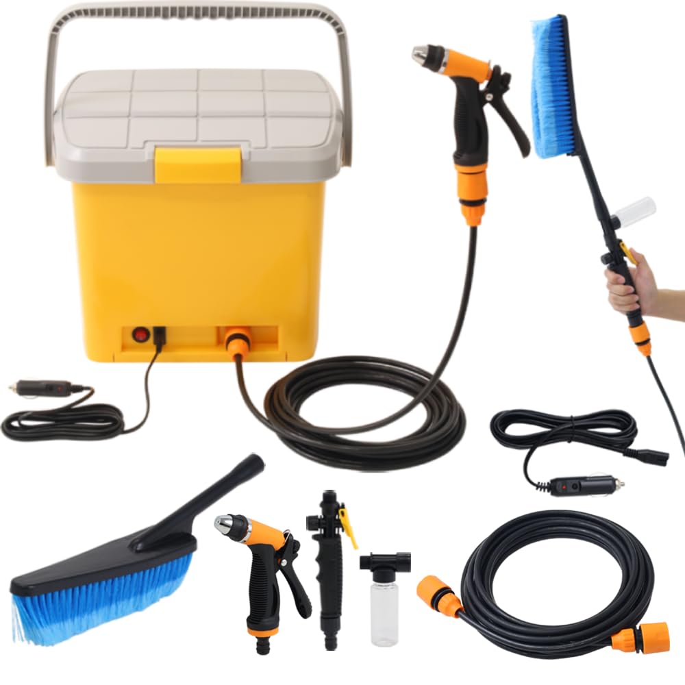 - Kit Completo 7 em 1: O kit de lavagem de carros vem com um balde de 18L com tampa, uma pistola de espuma com escova e dispenser de sabão, uma mangueira de 23 pés com bico ajustável para pulverização e um cabo elétrico de 9 pés que se conecta ao soquete do cigarro do veículo. Tudo que você precisa para uma limpeza exterior completa está aqui.