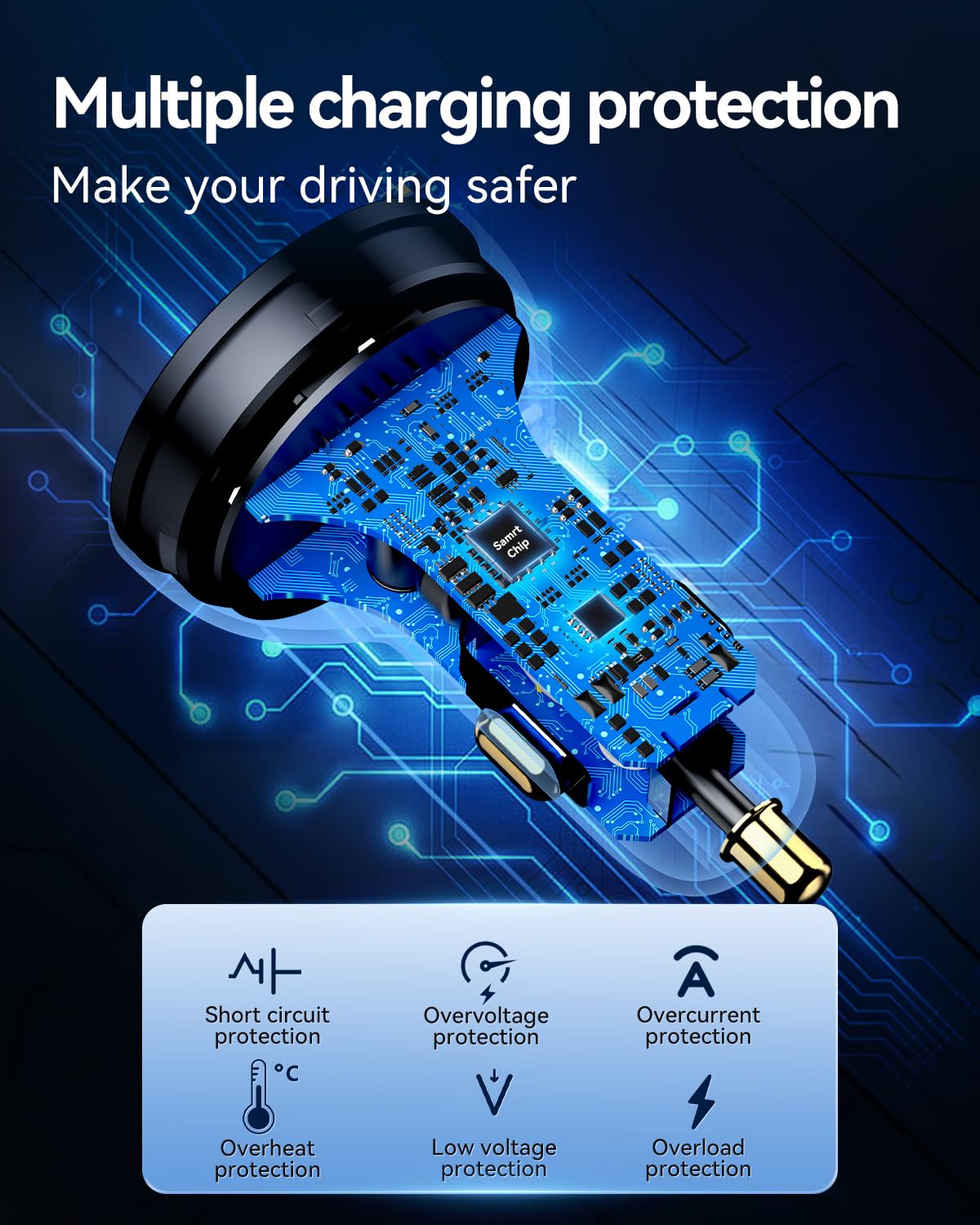 – Proteções Múltiplas de Carregamento: Certificado por FCC, CE e ROHS, este carregador é feito de material PC anti-chamas e possui um chip inteligente integrado que identifica automaticamente os dispositivos conectados, distribuindo a potência de carregamento ideal. Isso garante proteção contra sobrecarga, superaquecimento, curto-circuito e outros riscos, assegurando a segurança durante toda a viagem.