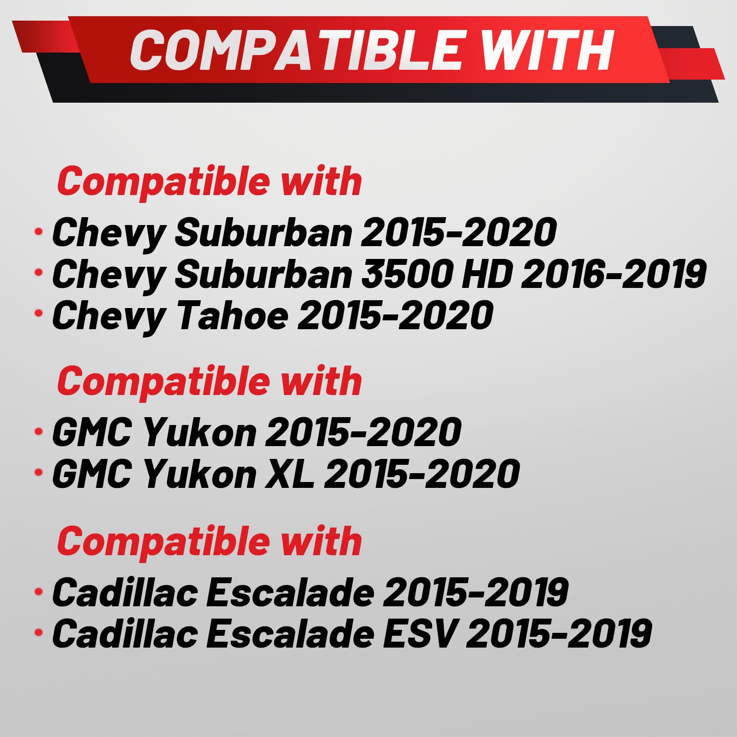 Aplicação: Compatível com Chevy Suburban 2015-2020, Tahoe 2015-2020, Suburban 3500 HD 2016-2019; GMC Yukon 2015-2020, Yukon XL 2015-2020; Cadillac Escalade 2015-2019.
