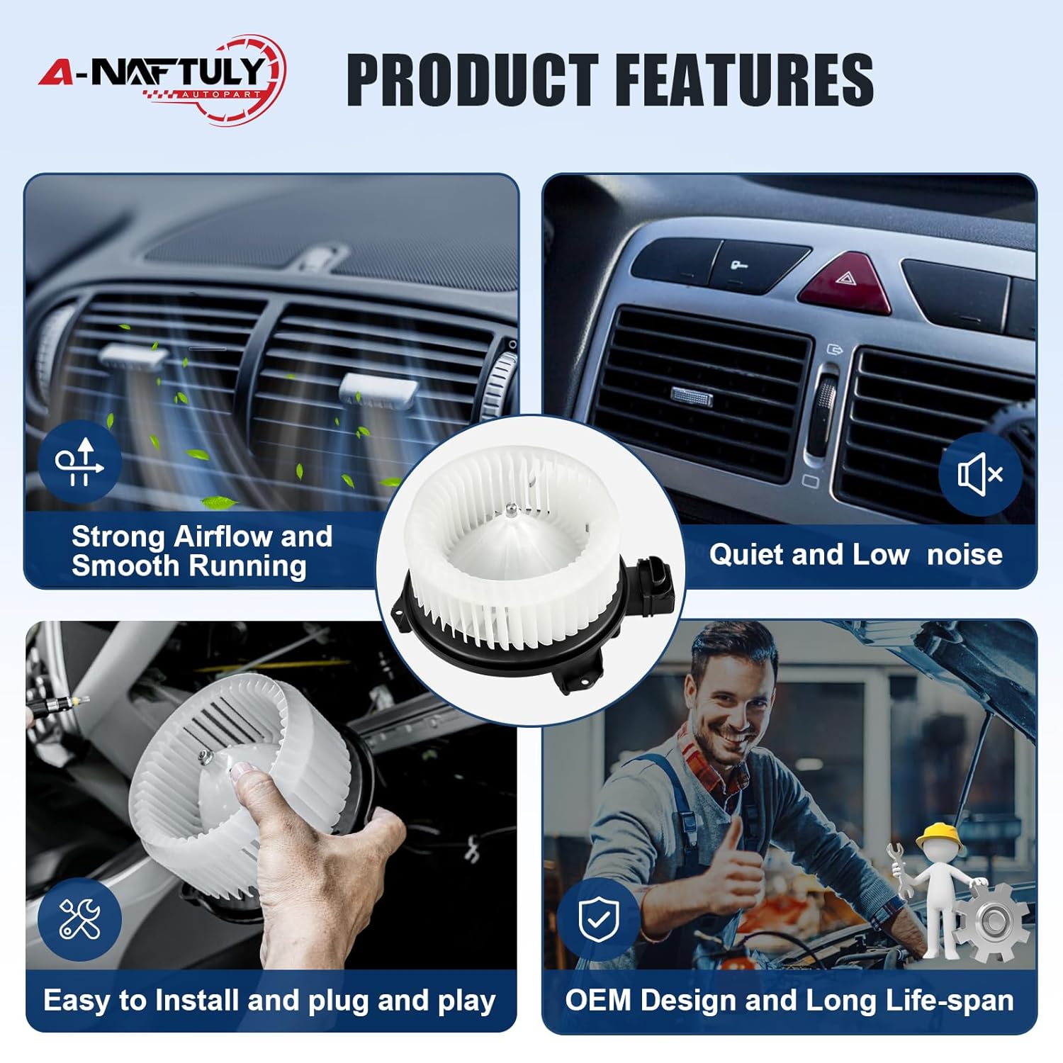 Fabricado com materiais de engenharia premium e plásticos duráveis, o design semelhante ao original garante integridade estrutural e estabilidade, reduzindo o atrito e prolongando a vida útil do produto. O motor do ventilador A-naftuly foi rigorosamente testado para atender aos padrões de qualidade, resistência ao desgaste e alta dureza, assegurando um fluxo de ar forte e operação silenciosa, eliminando ruídos incômodos e aumentando o conforto durante a condução.