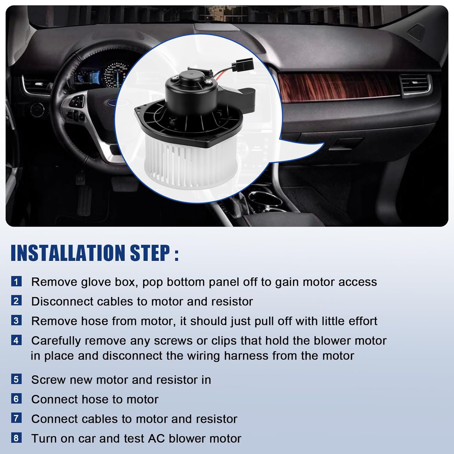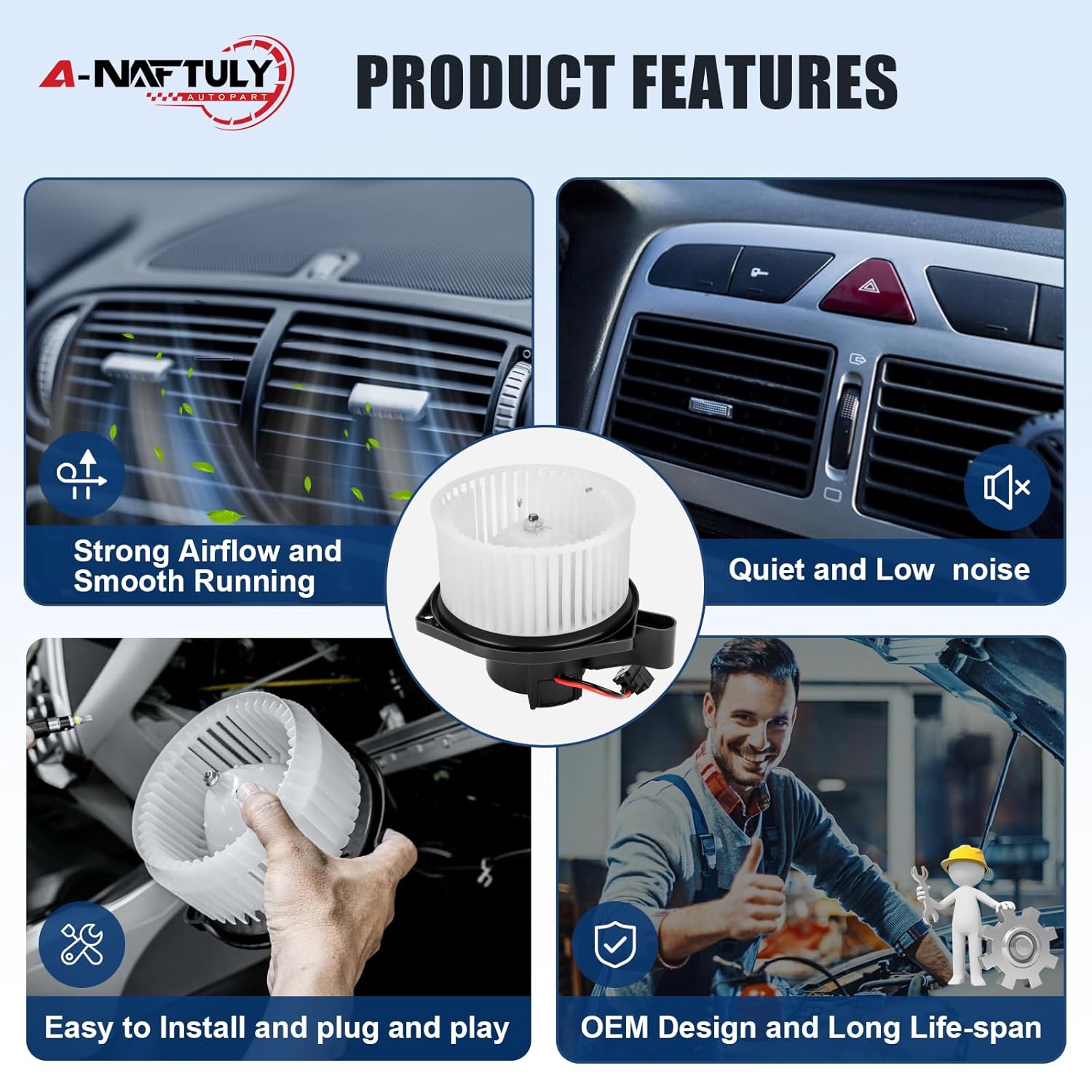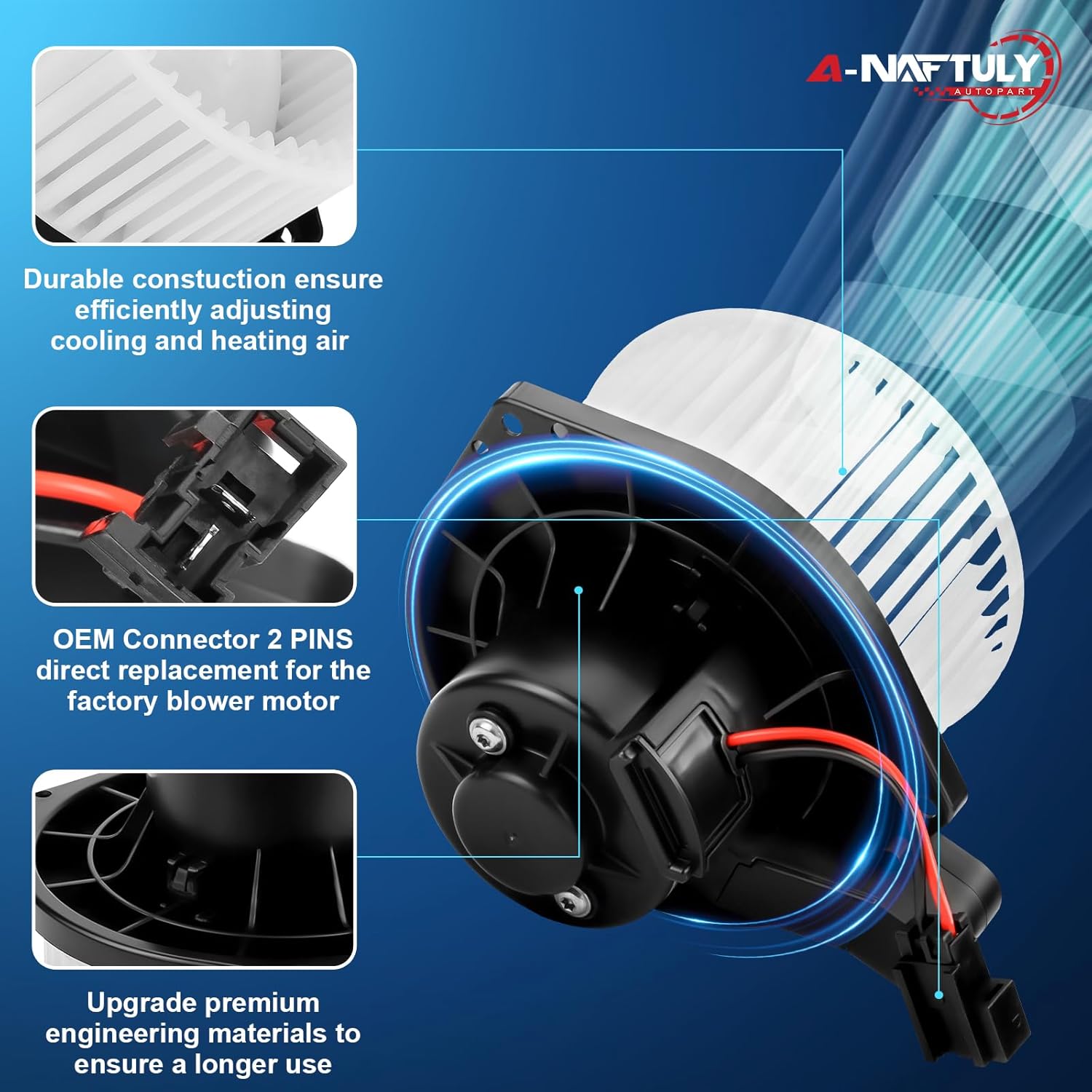 - [Função]: O motor do ventilador com a gaiola do ventilador é responsável por mover o ar aquecido ou resfriado através das aberturas do painel, de acordo com as configurações do sistema de ar condicionado e a velocidade do ventilador selecionada. Se o seu sistema HVAC estiver apresentando problemas como fluxo de ar fraco ou inexistente, ou fazendo barulhos altos, é hora de substituir o motor do ventilador do seu carro.