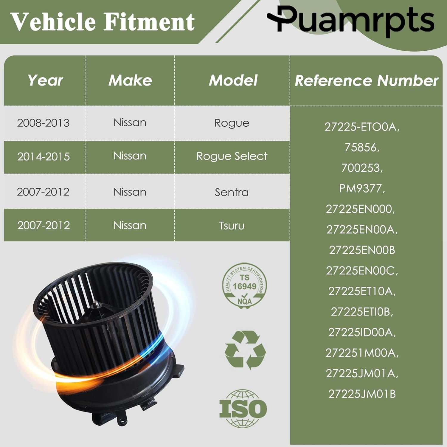 • Número da Peça de Substituição: 27225-ET00A, 75856, 700253, PM9377, entre outros. Este motor do ventilador atende ou supera os padrões OEM, sendo rigorosamente inspecionado e testado antes do envio.
