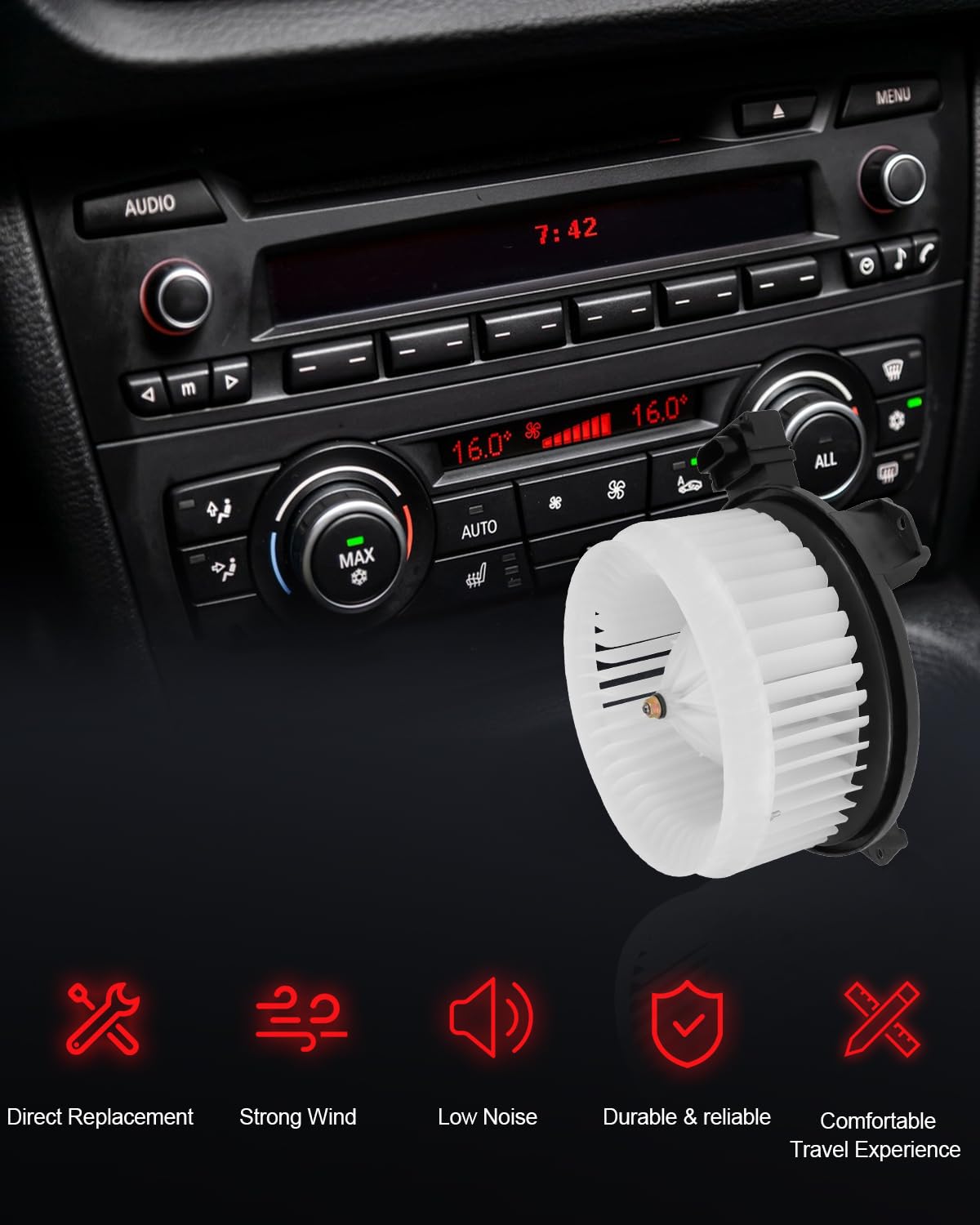 - [FORÇA DE VENTO INTENSA PARA O VEÍCULO] —- Este motor adota um rotor de aço silício, fio de cobre esmaltado, rolamentos auto-alinháveis permanentemente lubrificados e um motor eficiente, proporcionando uma saída de vento forte. Isso não apenas reduz a temperatura do motor, mas também fortalece o efeito do ar condicionado no carro, garantindo ar purificado e mantendo o desempenho do veículo.