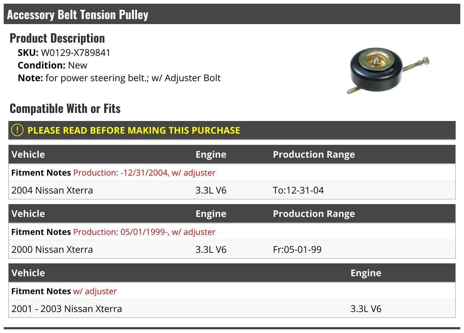 2 avaliações para Polia de Tensão do Acessório – Compatível com Nissan Xterra 3.3L V6 2000-2004 (De 01/05/1999 a 31/12/2004)
