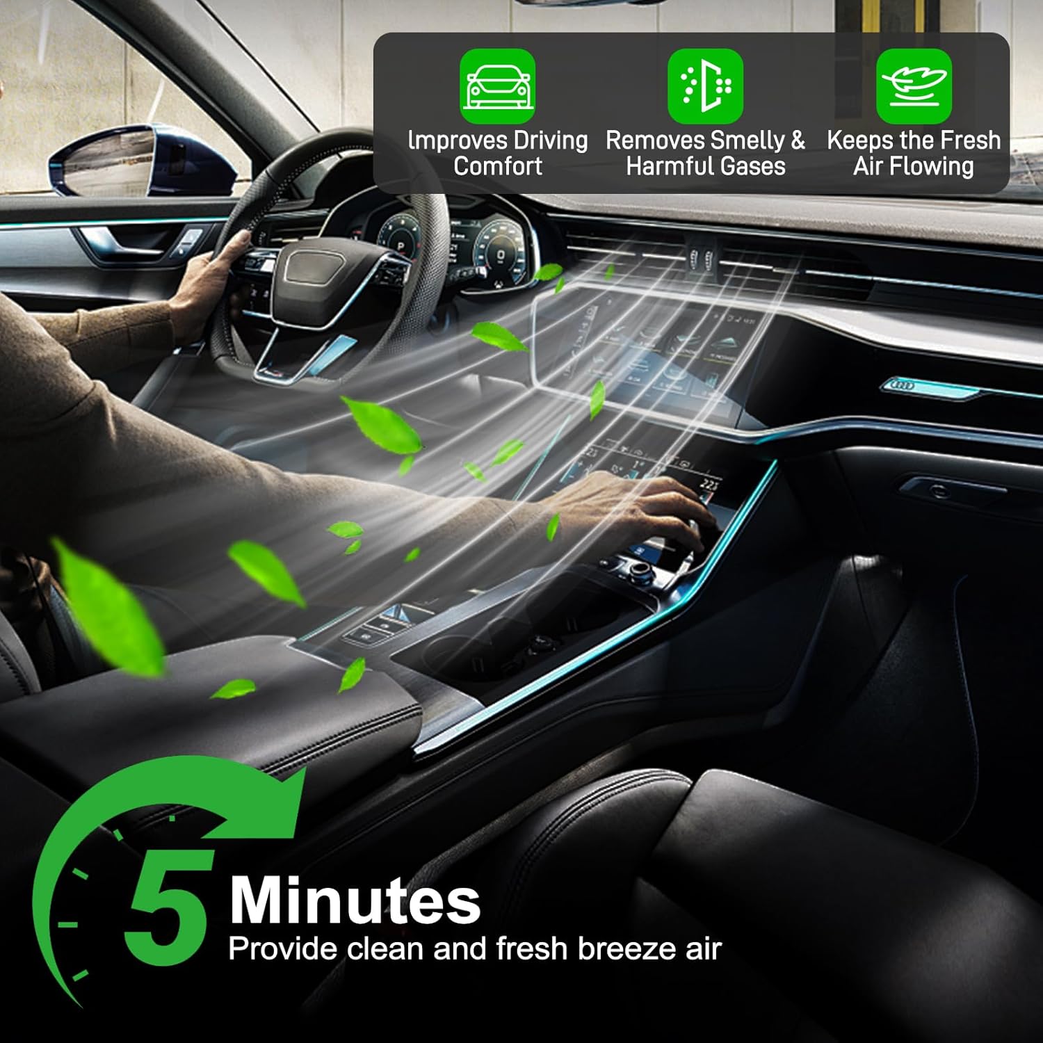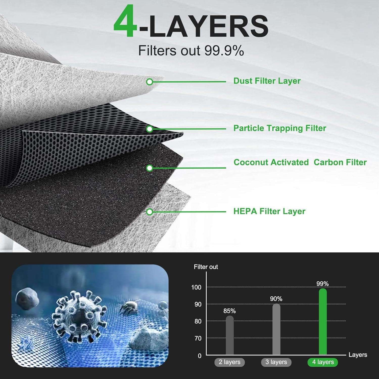 – Eficiência de Filtragem: Remove mais de 99% das partículas de poeira e absorve gases nocivos e odores.