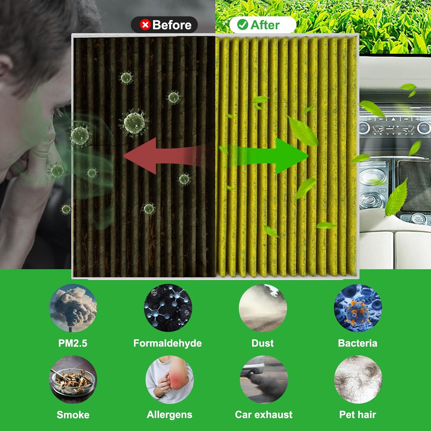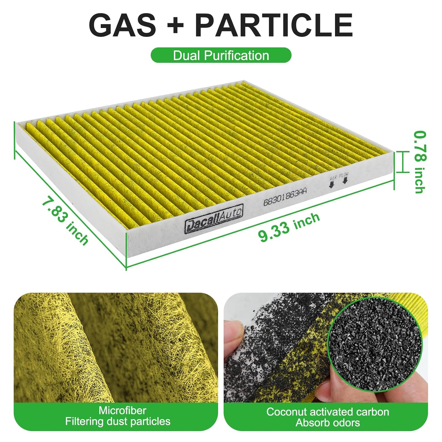 Substituindo os números de peça originais (OE NO.): Filtro Interno: 68301863AA; Filtro de Poeira: 68257030AA, o Filtro de Cabine DacallAuto utiliza uma tecnologia de filtragem tripla, composta por uma estrutura de 4 camadas. O carvão ativado de casca de coco é combinado com microfibras e tecido HEPA, proporcionando uma absorção eficaz de gases nocivos e odores desagradáveis, além de isolar mais de 99% das partículas de poeira. Isso garante uma proteção abrangente e uma experiência de respiração fresca e limpa.