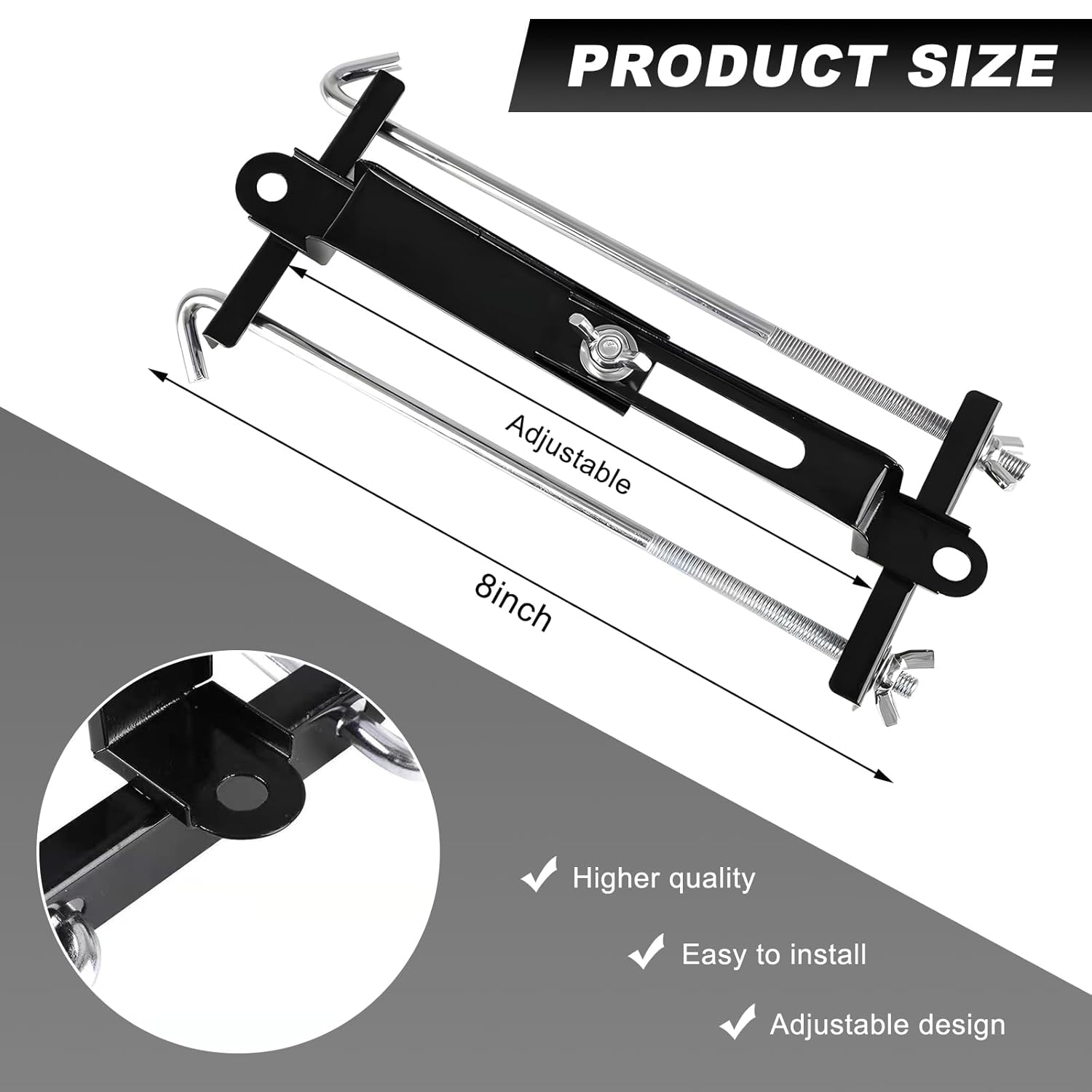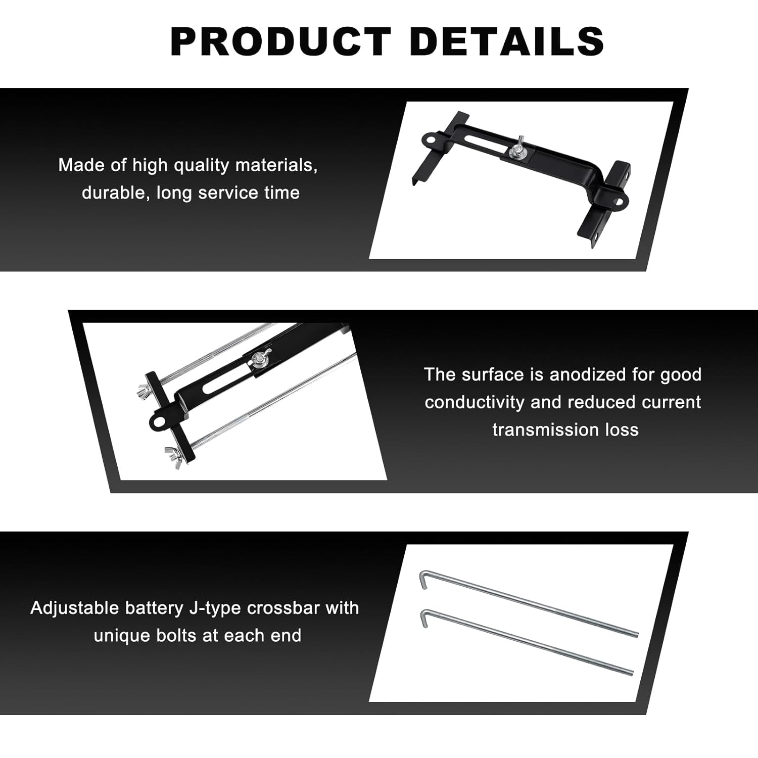 – Design Ajustável: A barra cruzada é ajustável de 6,69 a 9,44 polegadas, proporcionando facilidade de uso e adaptabilidade a diferentes tamanhos de bateria, eliminando a necessidade de trocas frequentes de suporte. O produto está disponível em três comprimentos de parafusos: 10,63 polegadas, 9,06 polegadas e 7,48 polegadas, permitindo ajustes conforme necessário.