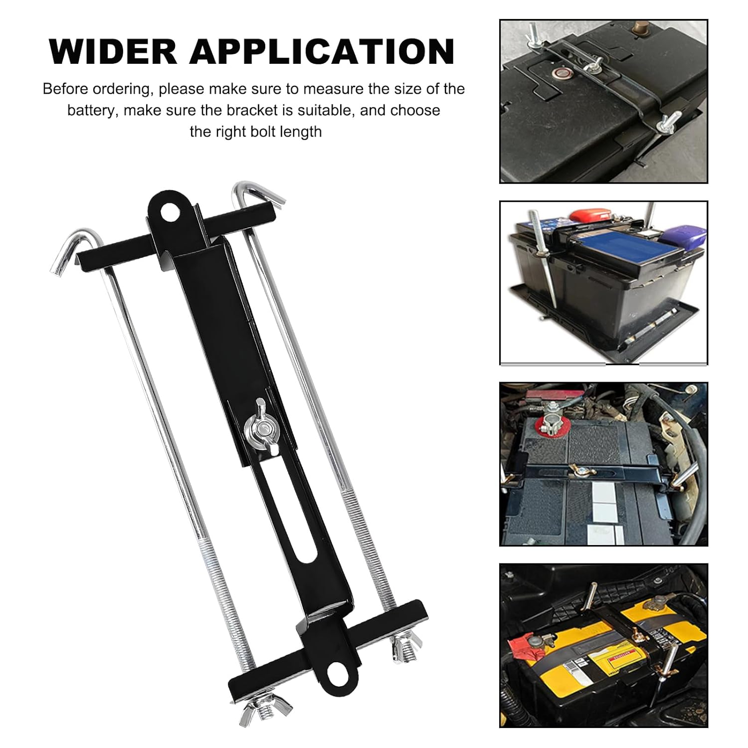 – Ampla Compatibilidade: Este suporte é compatível com uma variedade de veículos, incluindo carros, SUVs, caminhões, RVs e carrinhos de golfe, atendendo a diferentes necessidades de fixação. Recomenda-se medir as dimensões da sua bateria antes da compra para garantir a compatibilidade.