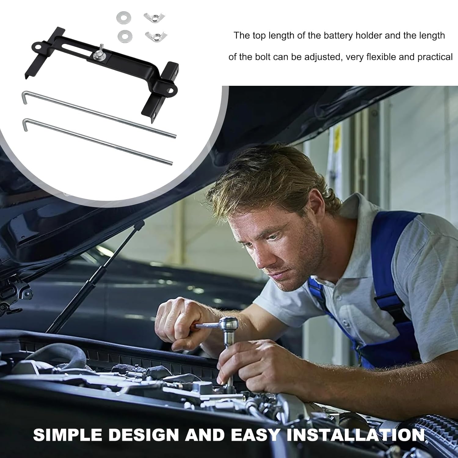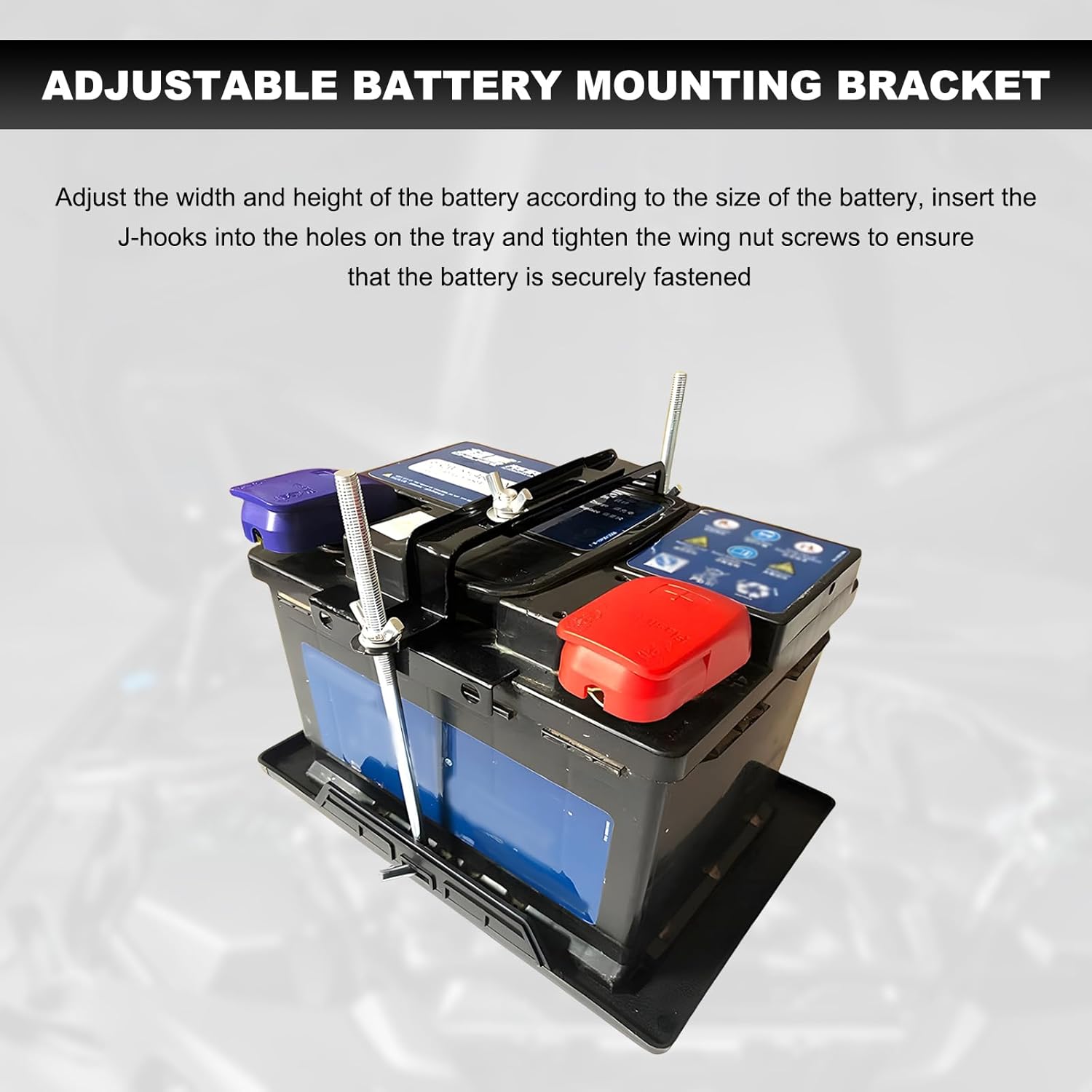 – Instalação Fácil: O suporte é projetado para uma instalação simples. Ajuste a largura e a altura do suporte para se adequar à sua bateria, insira os J-bolts nos orifícios designados da bandeja e aperte as porcas de asa para um encaixe seguro. O processo não requer ferramentas especiais, permitindo que os usuários realizem a instalação de forma independente.