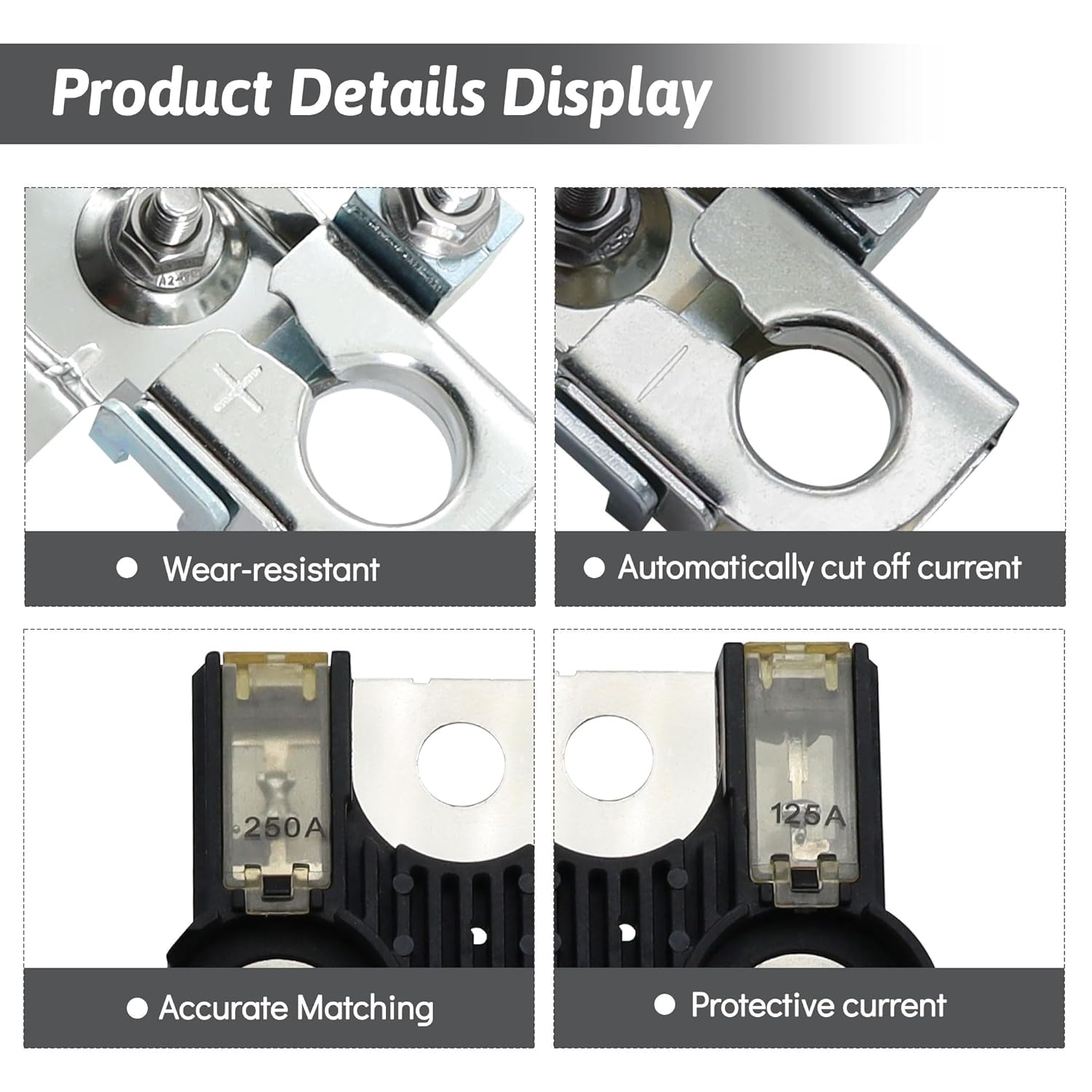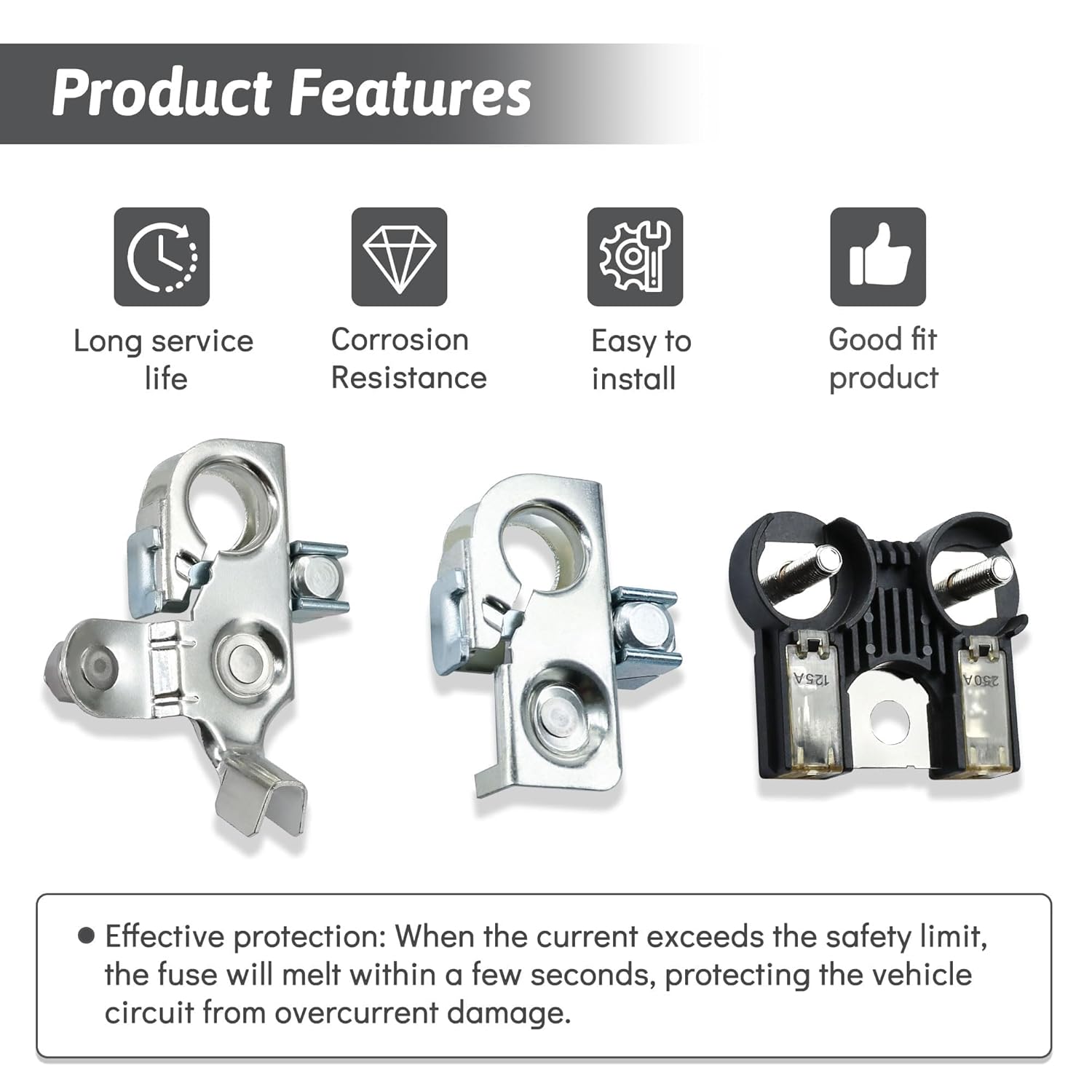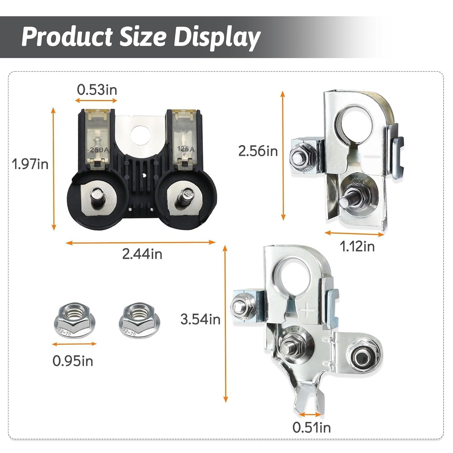 Conteúdo da Embalagem: O pacote inclui um clipe de terminal positivo do fusível da bateria, um clipe de terminal negativo do fusível da bateria, um terminal de fusível da bateria e duas porcas, oferecendo tudo o que você precisa para uma instalação completa.
