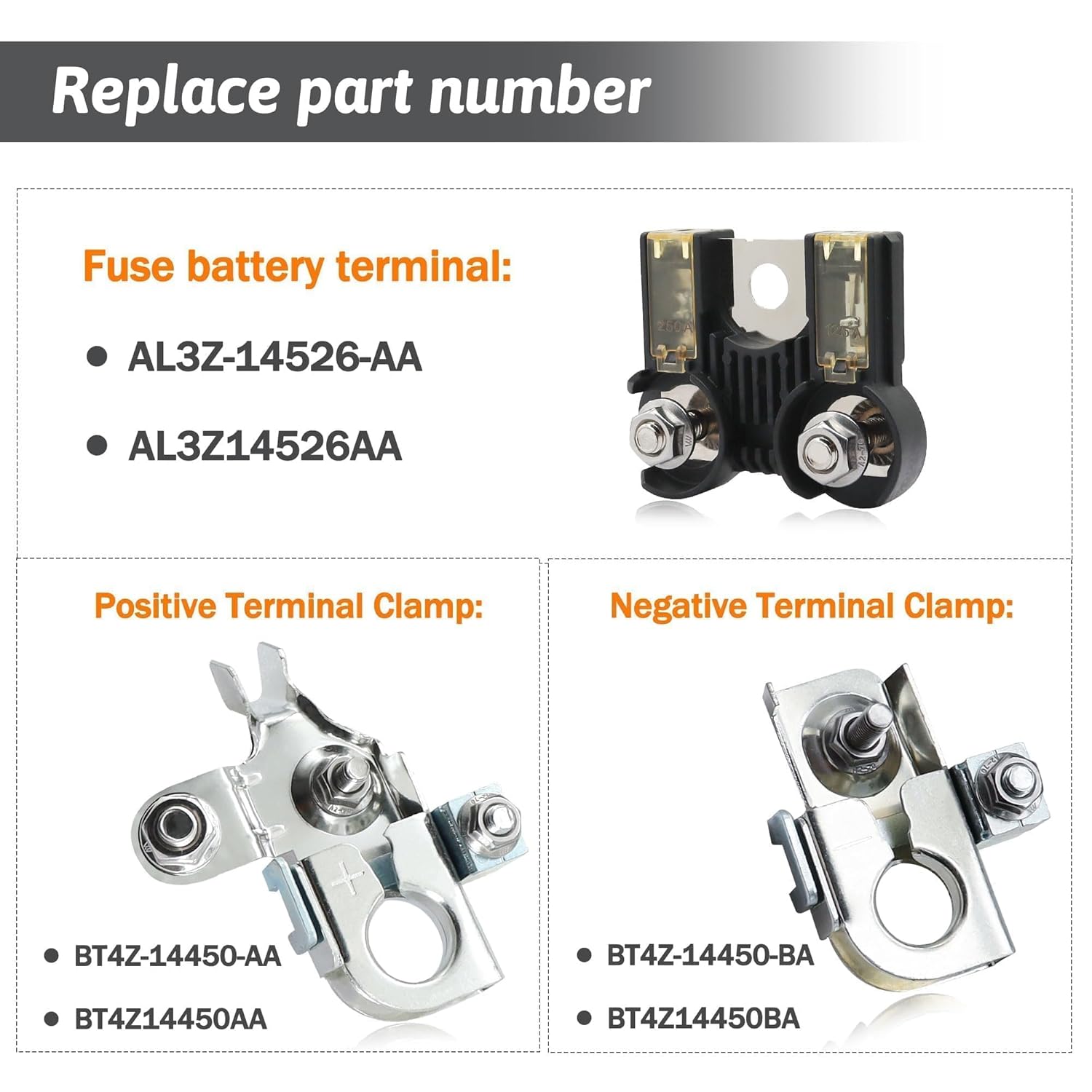 Descrição do Produto: Combo Pack AL3Z-14526-AA BT4Z-14450-AA BT4Z-14450-BA – Fusível da Bateria e Positivo