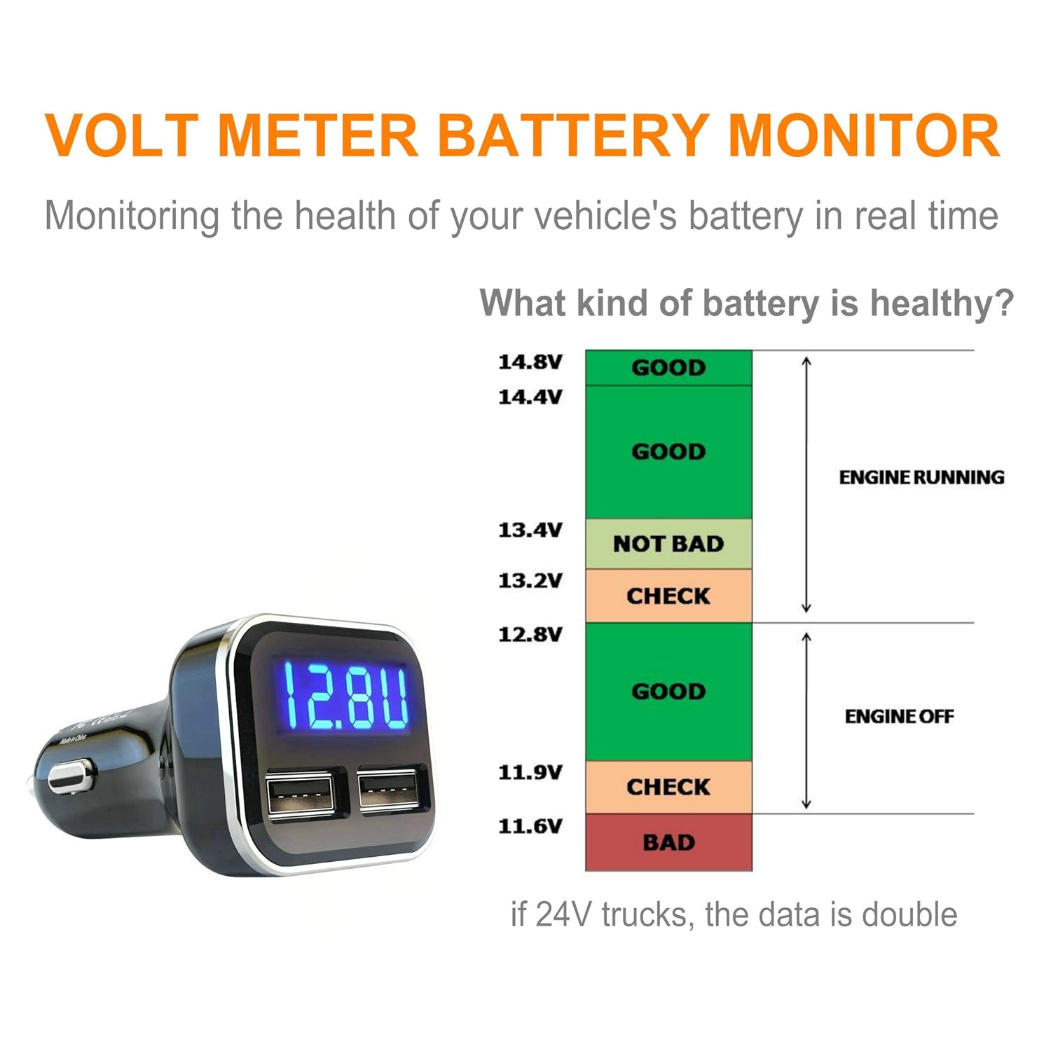 Além disso, o monitor de voltagem e amperagem permite que você acompanhe a voltagem da bateria do carro mesmo quando não estiver carregando dispositivos. Durante o carregamento, o display alterna entre a corrente de carregamento do dispositivo e a voltagem da bateria do veículo, proporcionando um controle total sobre o estado da sua bateria.