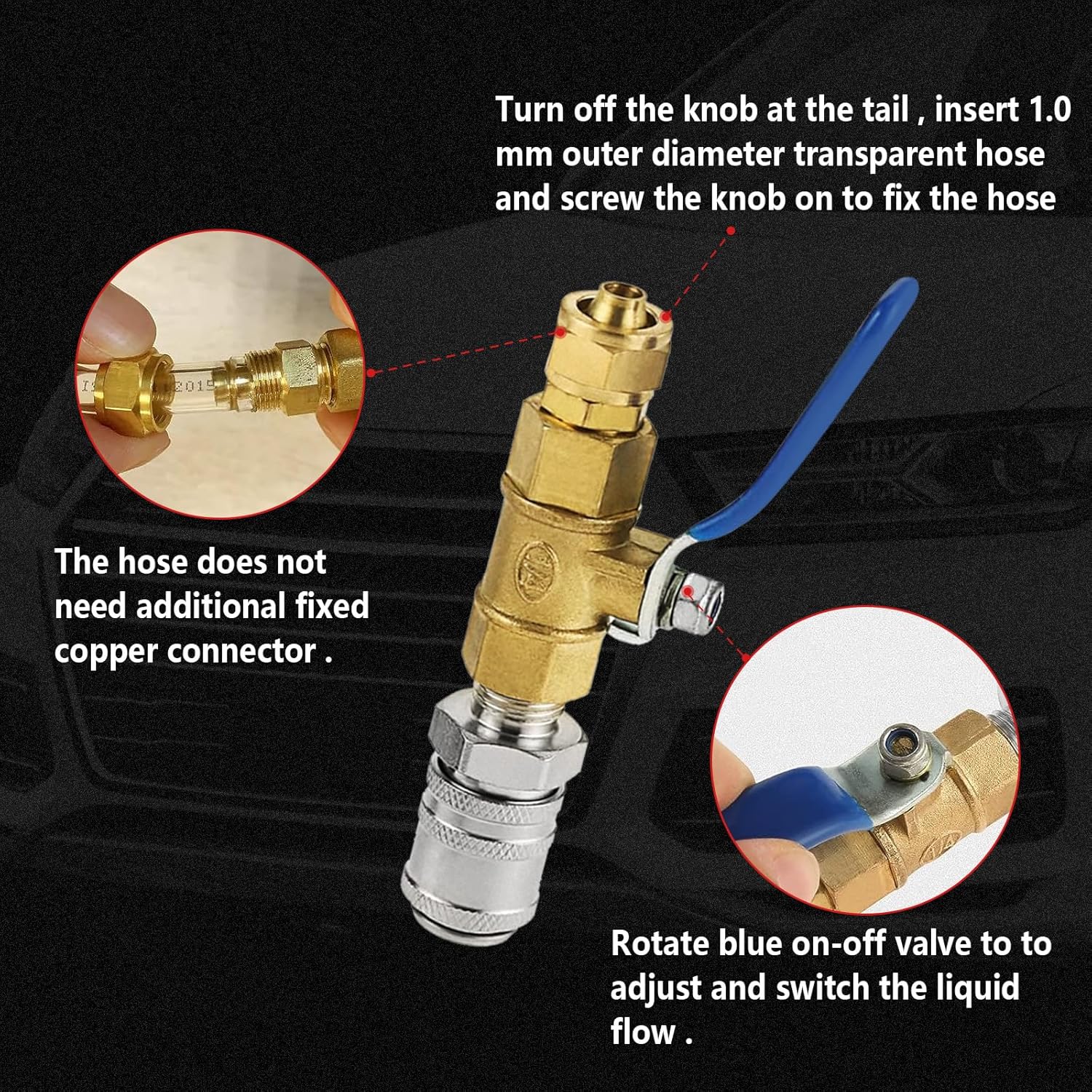 O dispenser metálico, equipado com uma válvula de fechamento, conecta-se facilmente ao dispositivo de enchimento e à mangueira de distribuição de fluido com diâmetro externo de 1,0 mm. Seu design permite um ajuste fácil e a troca do fluxo de líquido, assegurando uma operação amigável e eficiente.