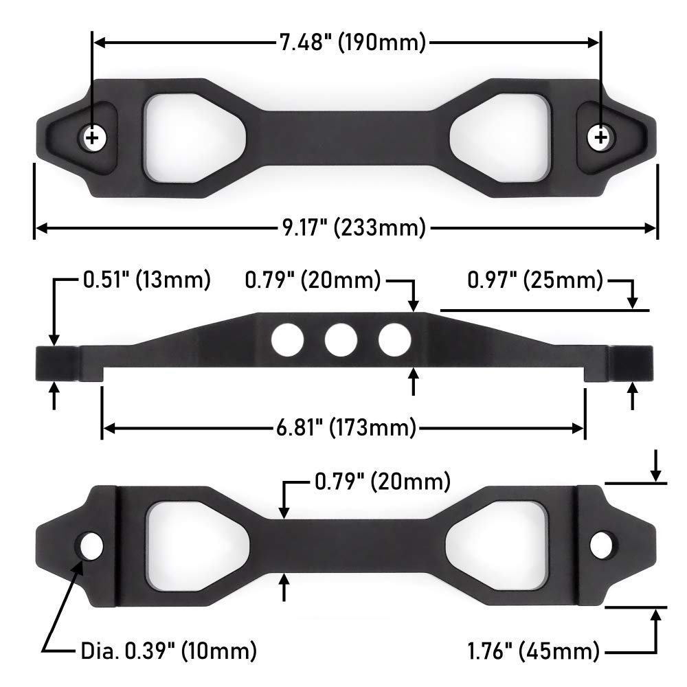 – Dimensões: Comprimento total de 9,17″ (233 mm) e espaçamento entre furos de 7,48″ (190 mm).