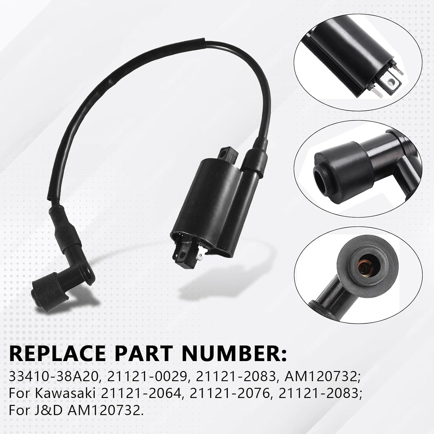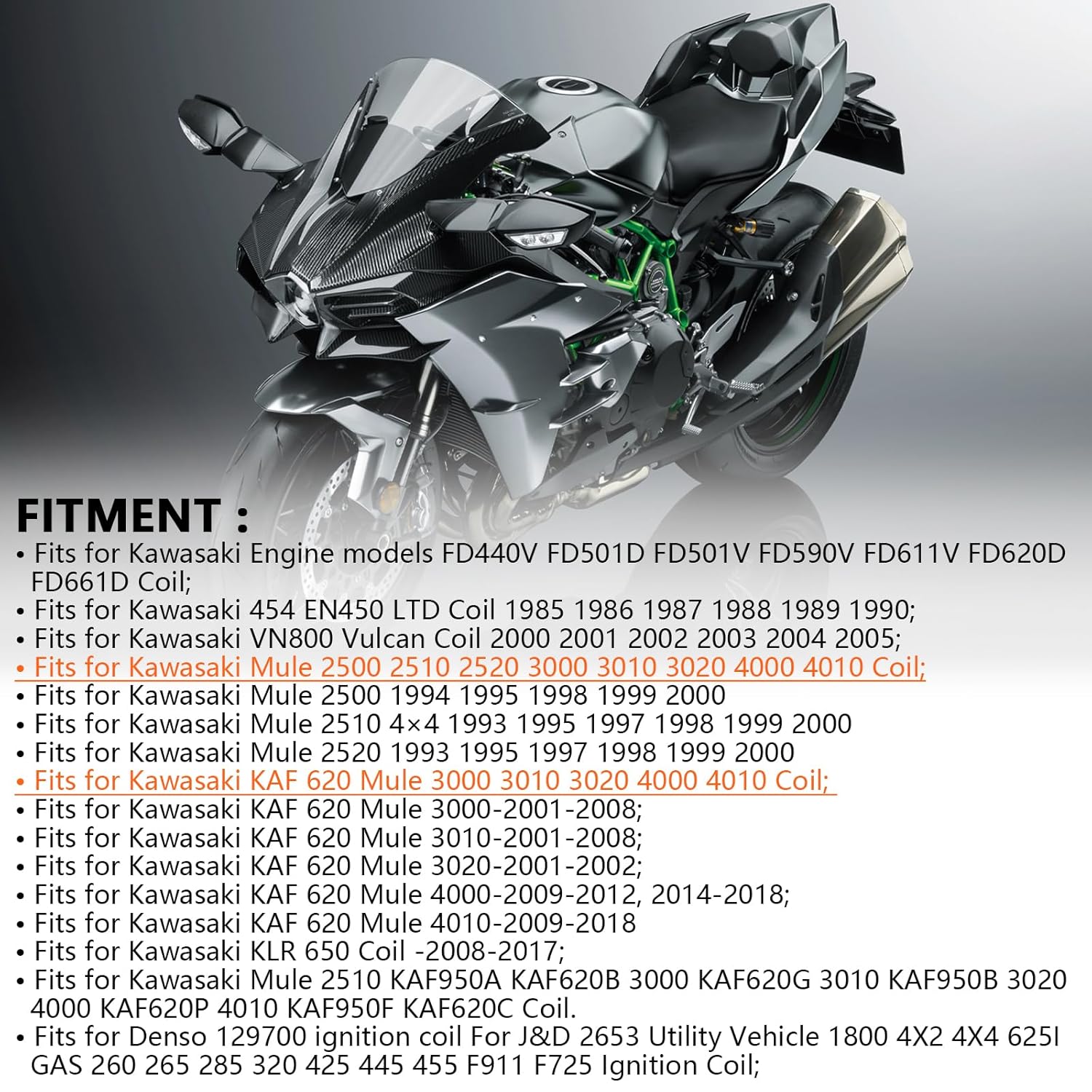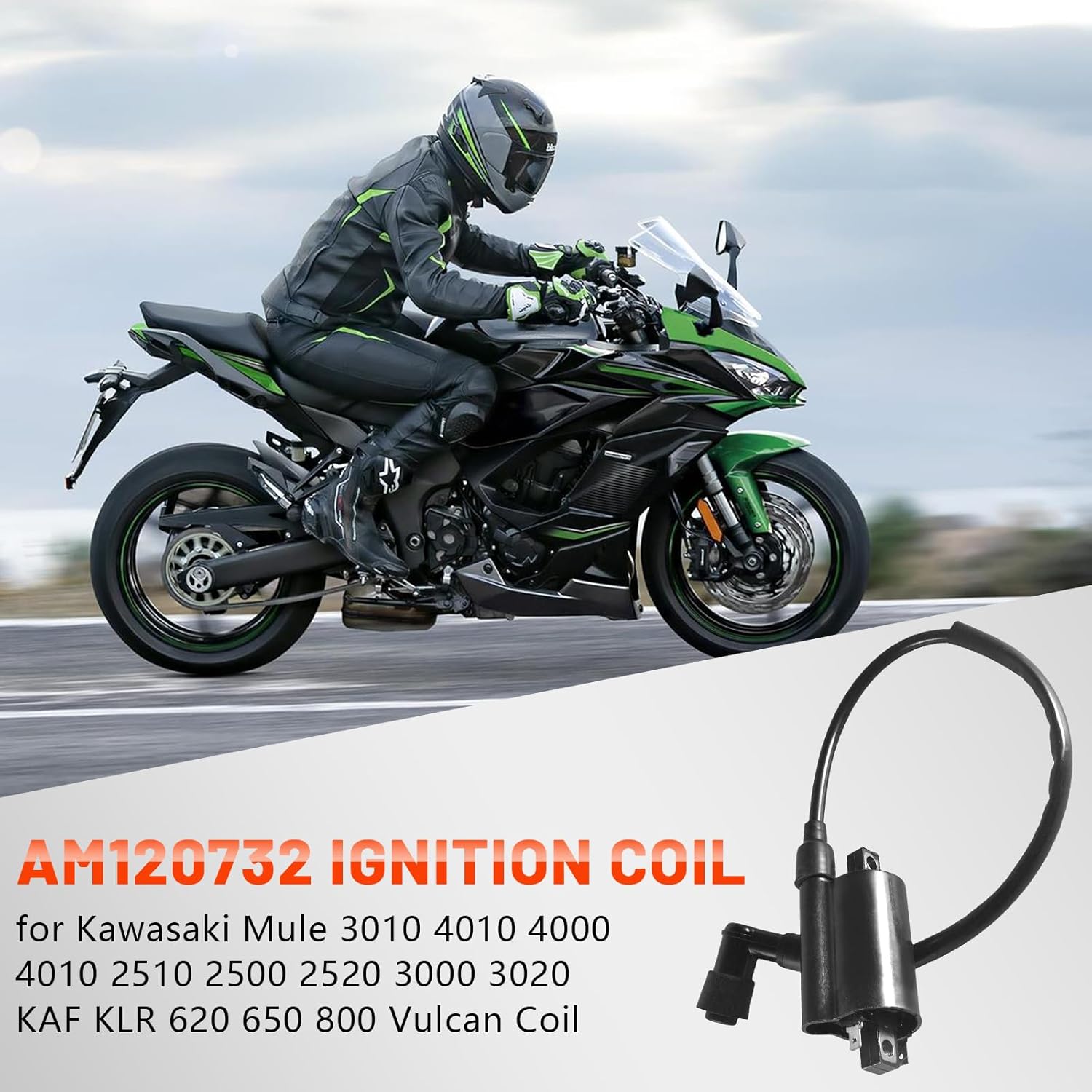 - Compatibilidade: A Bobina de Ignição AM120732 é compatível com motores Kawasaki FD440V, FD501D, FD501V, FD590V, FD611V, FD620D e FD661D. Ela se encaixa perfeitamente em diversos modelos de Kawasaki Mule, como 2500, 2510, 2520, 3000, 3010, 3020, 4000 e 4010, além de ser adequada para a linha de motocicletas Kawasaki 454 EN450 LTD e VN800 Vulcan.