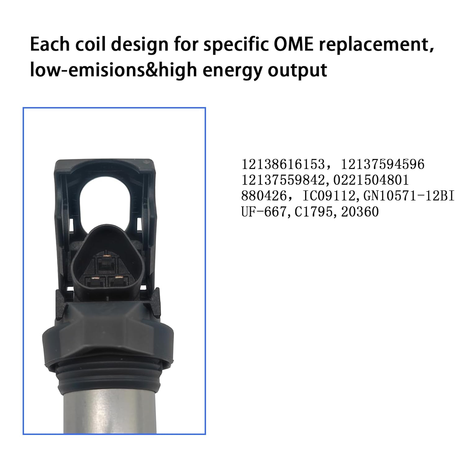 As bobinas de ignição AMCC são projetadas com cobre de alta qualidade, garantindo uma performance superior e confiabilidade para uma ampla gama de veículos BMW, incluindo as séries 1, 2, 3, 4, 5, 6, 7, além dos modelos X3, X4, X5, X6, Z4, M3 e motores N20, N13, N14, N18, N52, N54, N55, N74, N62 e M54. Cada bobina é testada em condições reais de estrada, assegurando que você tenha um produto que não apenas atende, mas supera as exigências do equipamento original (OE).
