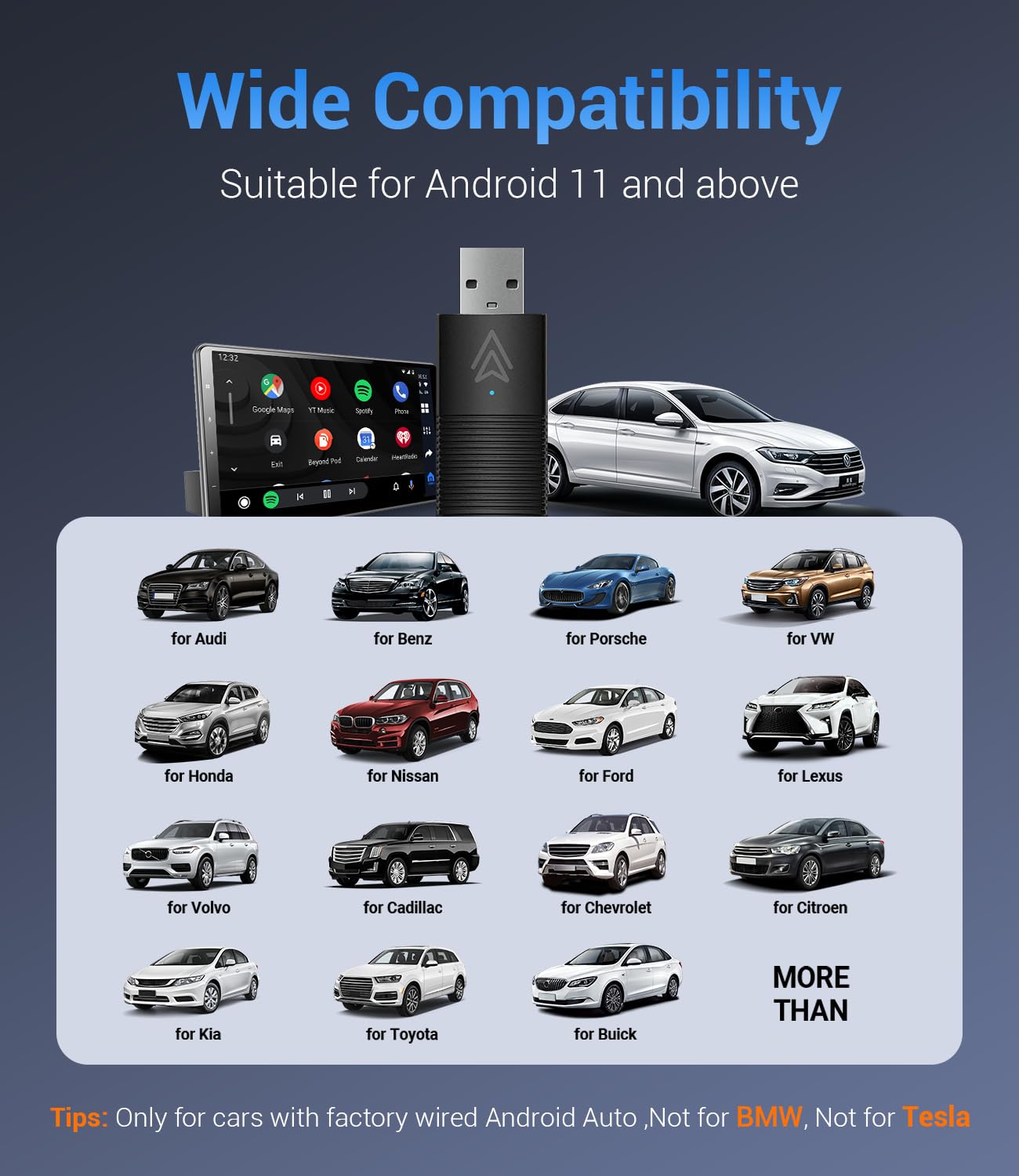 Este dongle wireless é compatível com mais de 500 veículos que possuem Android Auto com fio, além de funcionar com smartphones que rodam Android 11 ou superior. No entanto, não é compatível com modelos da Subaru, Toyota GR86, RAIZE, ROOMY, Nissan GTR, Peugeot 3008, BMW ou Tesla.