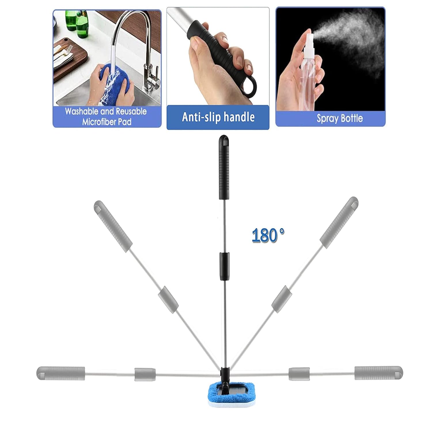 O cabo do limpador de para-brisa é ergonomicamente projetado, com um acabamento antiderrapante que proporciona conforto durante o uso. Ele se estende de 37 cm a 58 cm, permitindo alcançar áreas difíceis, como a parte inferior das janelas do carro. A cabeça quadrada, que pode ser girada em 180 graus, garante um contato completo com o vidro, facilitando a limpeza de locais de difícil acesso. Com isso, você pode remover a sujeira e o embaçamento de forma eficiente e sem esforço.