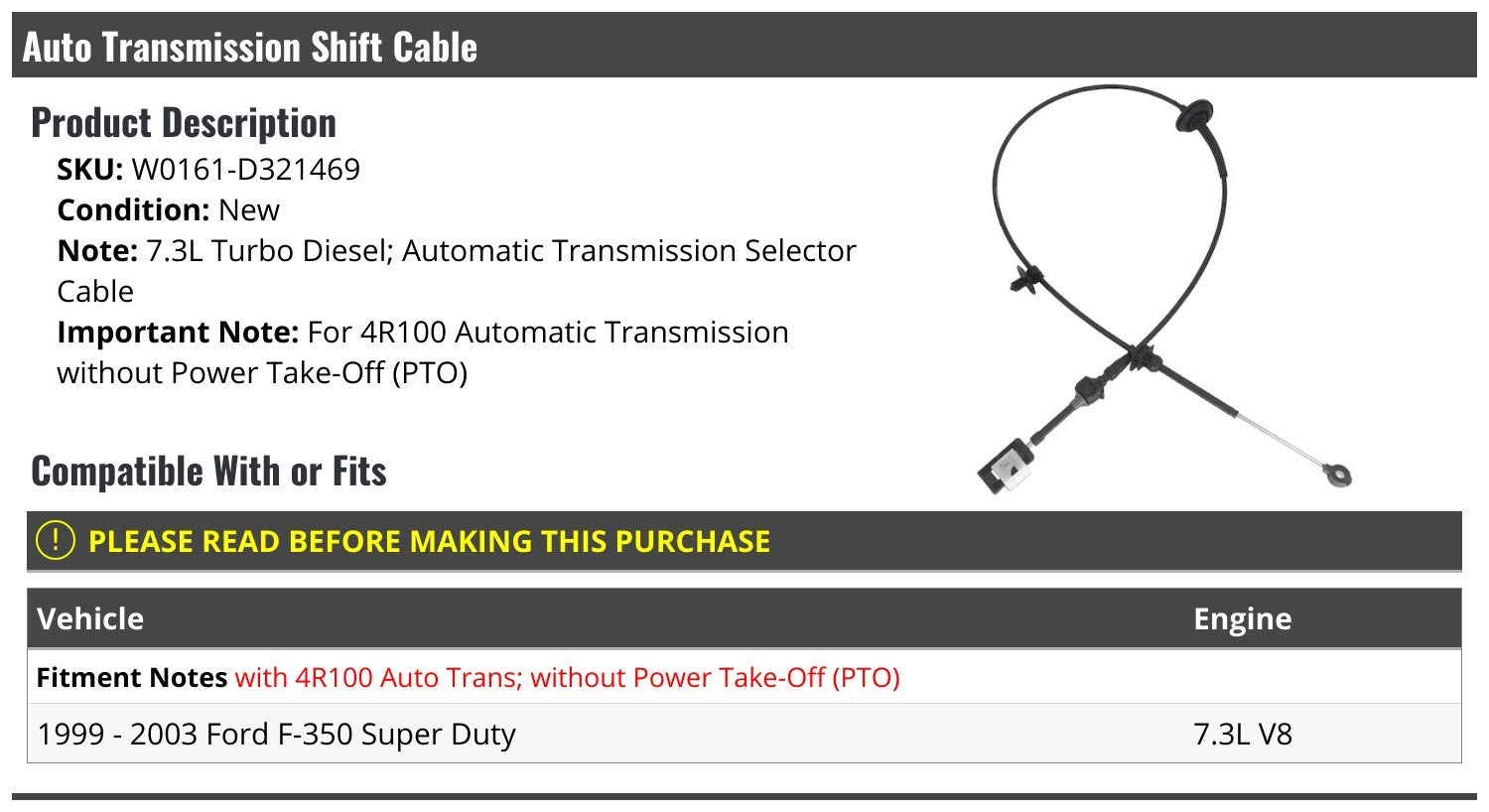 O Cabo de Seleção de Transmissão Automática é um componente essencial para o funcionamento adequado do sistema de transmissão do seu Ford F-350 Super Duty 7.3L V8 Turbo Diesel, fabricado entre 1999 e 2003. Este cabo é projetado especificamente para a transmissão automática 4R100, sem a opção de Power Take-Off (PTO), garantindo uma compatibilidade perfeita e um desempenho otimizado. Com a instalação deste cabo, você pode esperar uma troca de marchas suave e eficiente, essencial para a performance robusta que o seu veículo oferece.