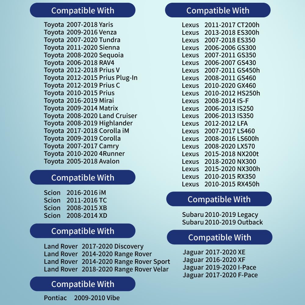 – Compatibilidade: Projetado para modelos Toyota como Prius V, RAV4, 4Runner, Highlander, Avalon, Matrix, Land Cruiser, Tundra, Corolla, Venza e Sequoia.