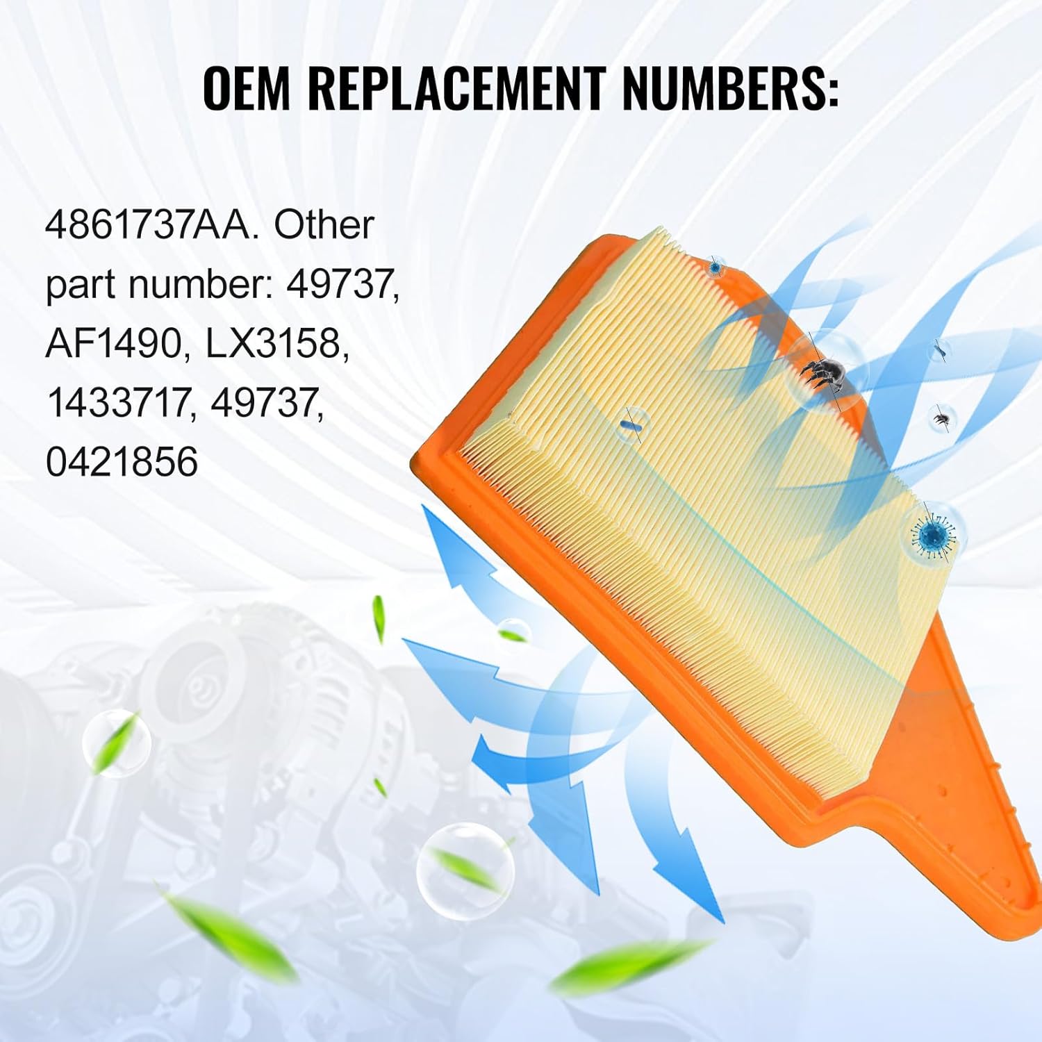 – Substituição OEM: O número de peça de substituição é 4861737AA, com outros números de parte compatíveis como 49737, AF1490, LX3158, 1433717 e 0421856, assegurando que você tenha a peça correta para seu veículo.