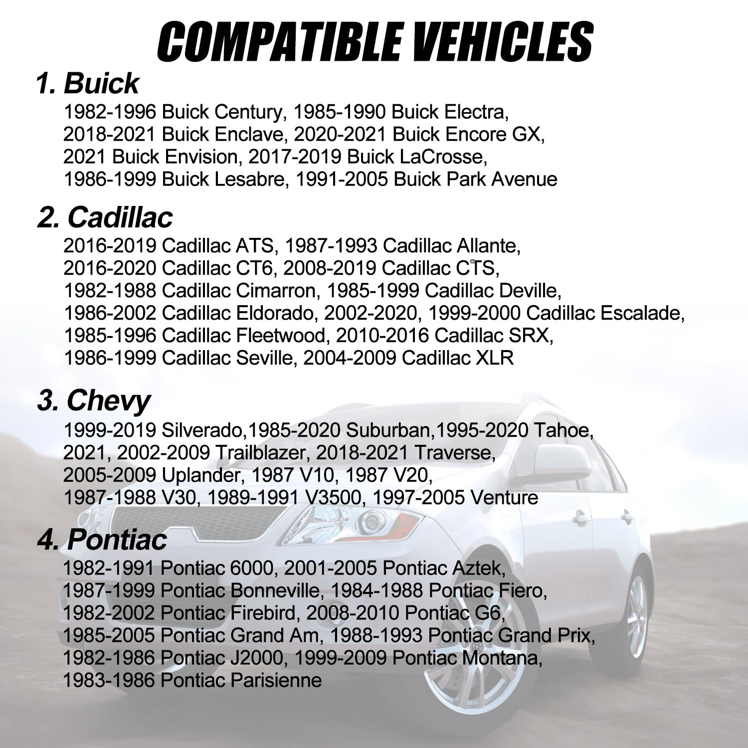Este produto é especificamente projetado para modelos da Buick, Cadillac, Chevy e Pontiac, permitindo a substituição perfeita de peças desgastadas ou danificadas. É importante ressaltar que o nosso produto não é patrocinado, endossado ou afiliado às marcas mencionadas.