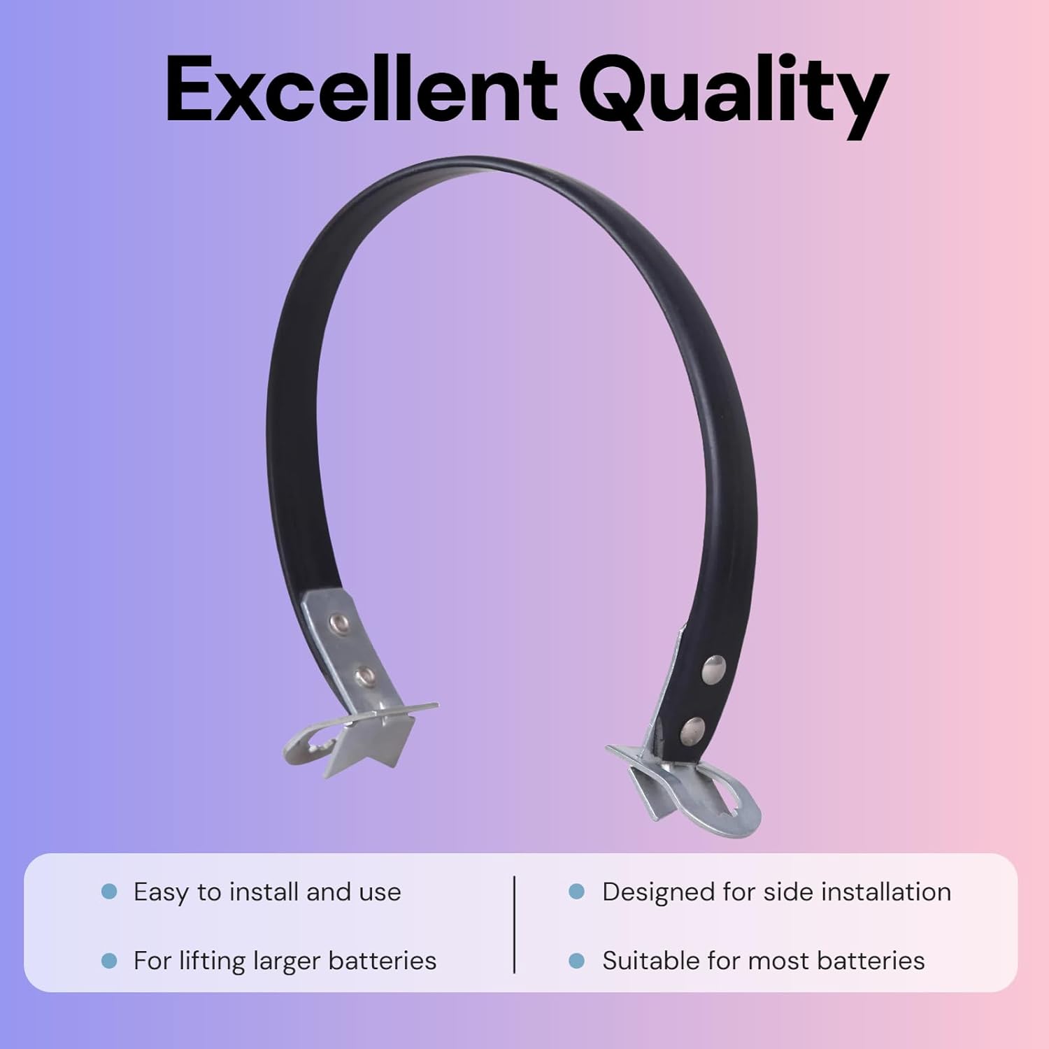 Este strap é amplamente aplicável, sendo ideal para levantar baterias de tamanhos maiores. Sua compatibilidade universal permite que se adapte à maioria das baterias disponíveis no mercado, tornando-o um acessório indispensável para mecânicos, eletricistas e entusiastas automotivos.