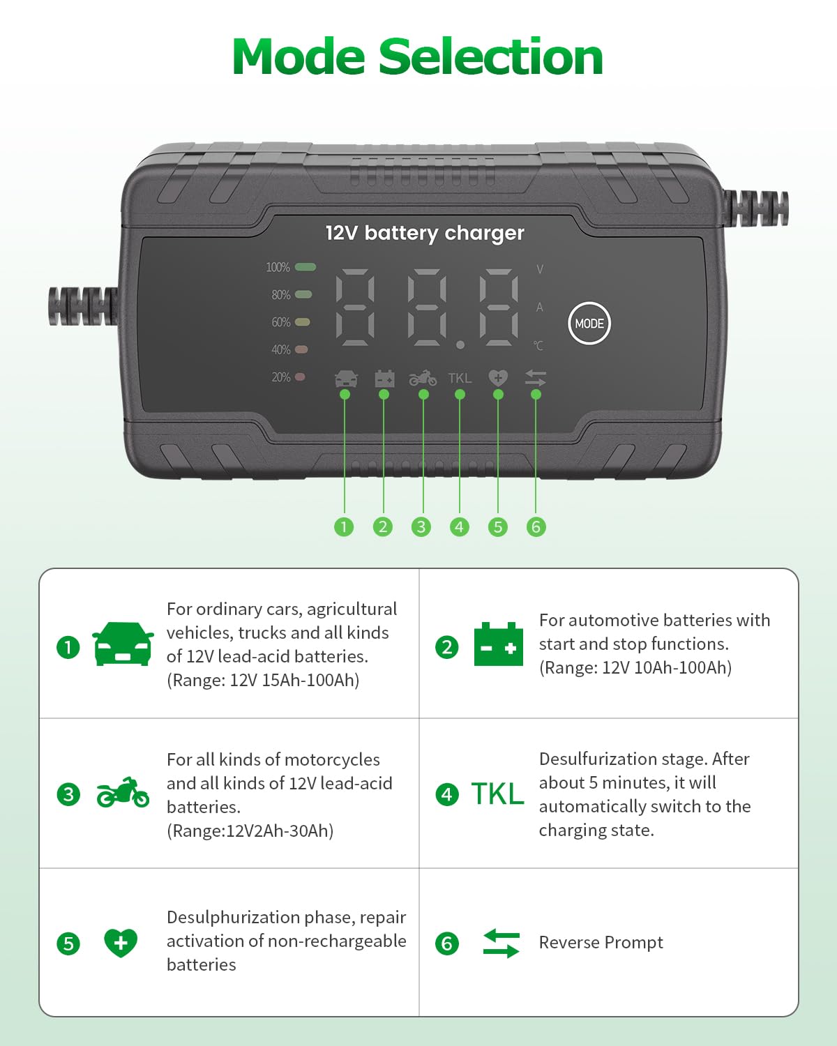 Carregador de Bateria 12V 6A – Carregador Inteligente Trickle 12FT para Baterias de Carro e Cortadores de Grama com Manutenção 8 Estágios e Compensação de Temperatura