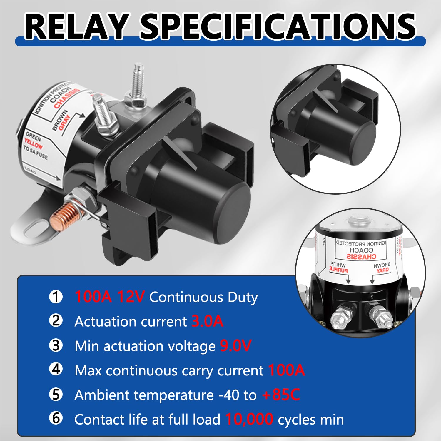 Operação Eficiente: O Relay de Desconexão de Bateria oferece um meio conveniente e seguro de desconectar remotamente as baterias de um RV ou barco. Isso ajuda a prevenir o esgotamento da bateria quando seu veículo não está em uso, prolongando a vida útil da bateria e garantindo que você esteja sempre pronto para a próxima aventura.